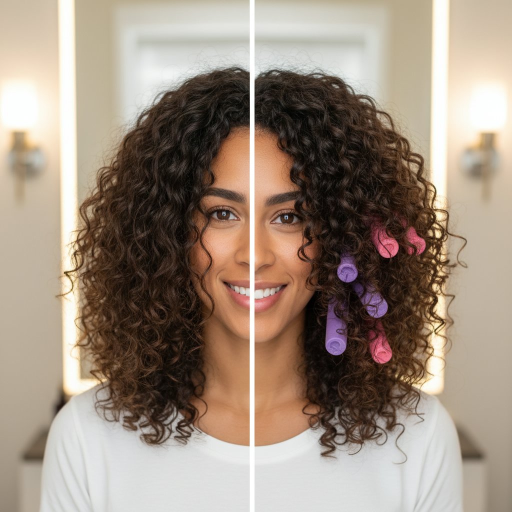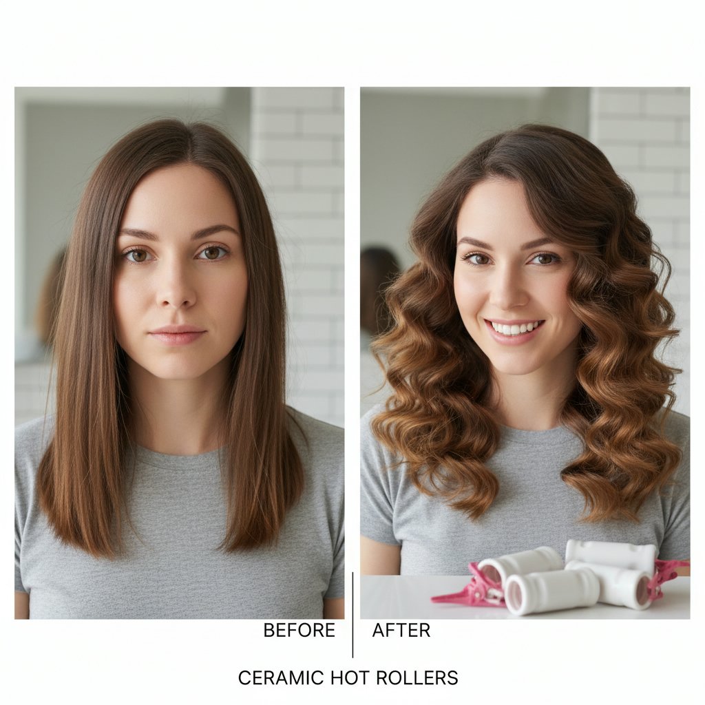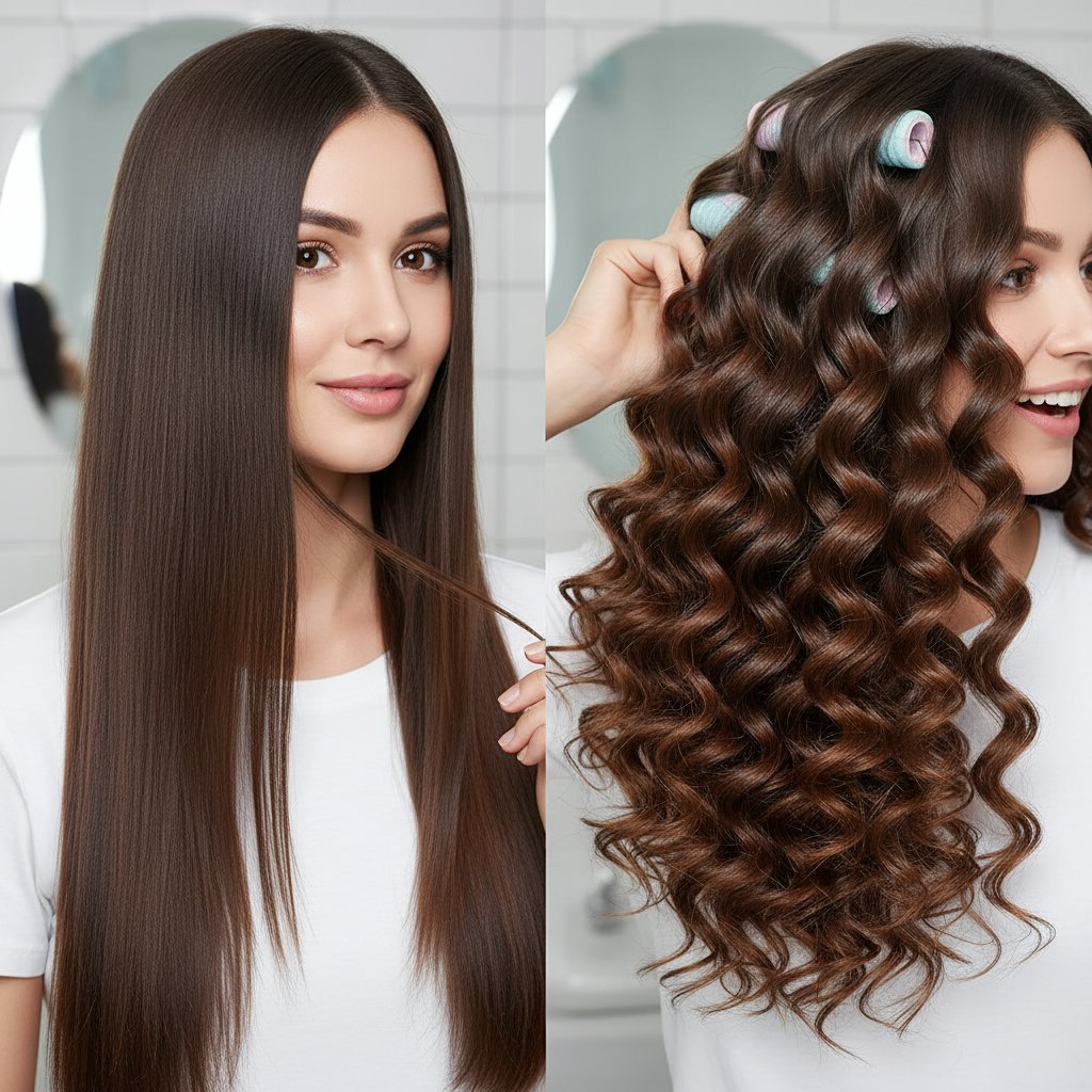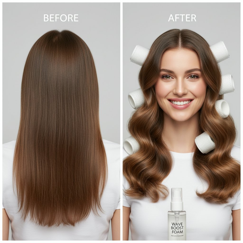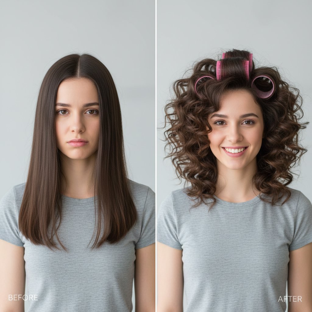 Before: Straight, lifeless hair. After: Gentle, soft waves achieved with foam rollers, ideal for overnight styling.