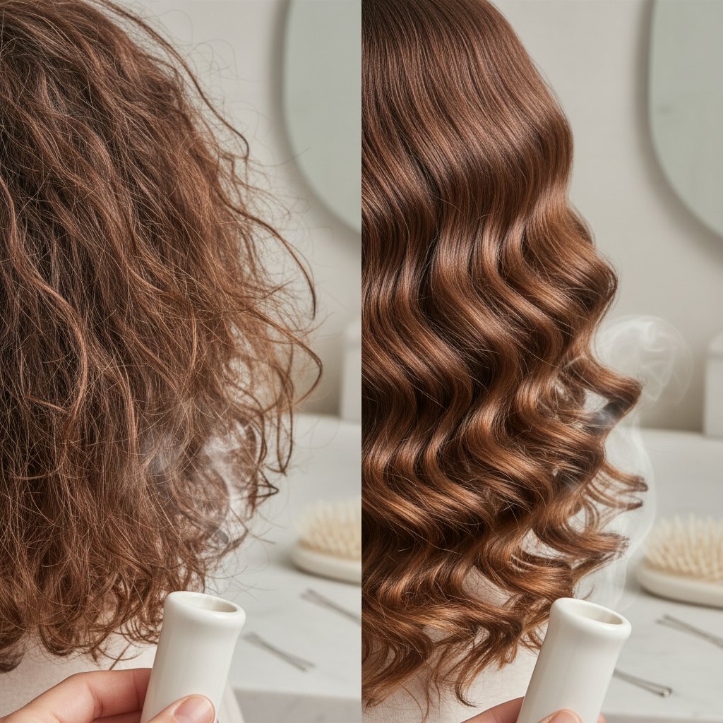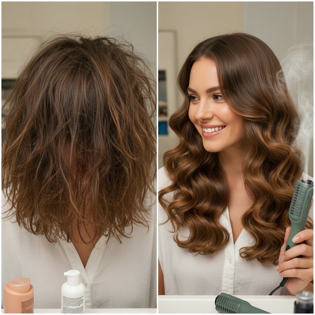 Before: Coarse, unruly hair. After: Sleek, smooth curls with a salon-quality finish, achieved with heated rollers.
