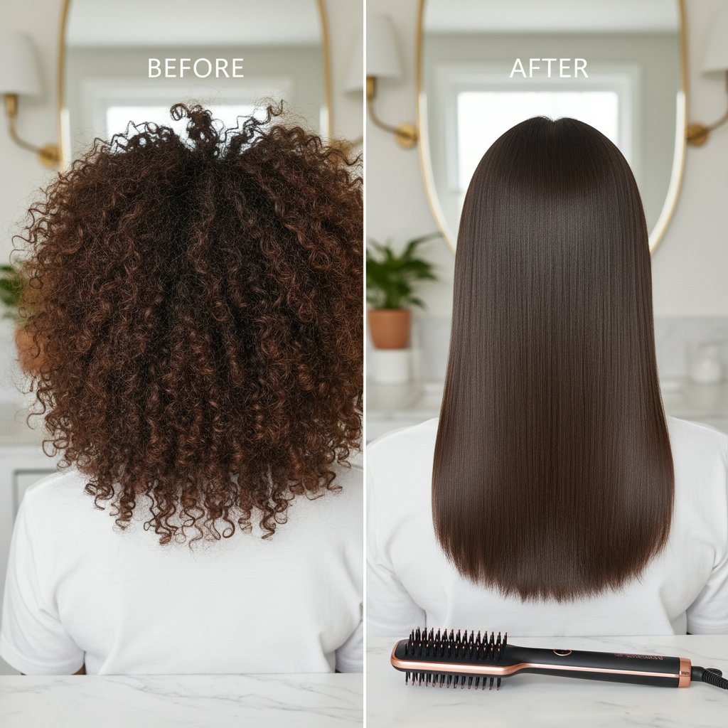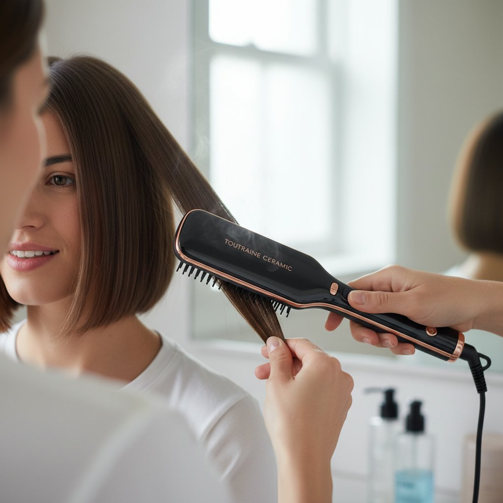 See how effortlessly a hair straightening brush glides through thick hair, taming it into a silky-smooth mane without excessive heat.