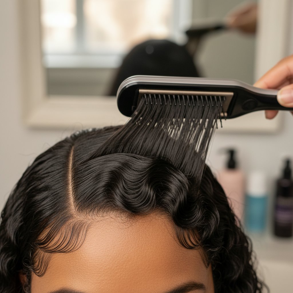 Master the art of smoothing edges and baby hairs with a hair straightening brush, achieving a flawless finish.