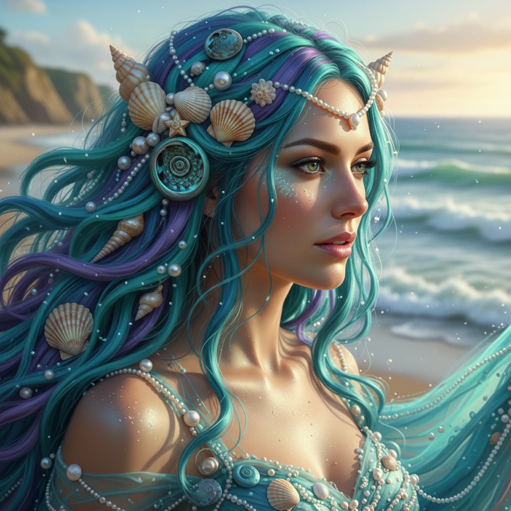 Dive into the deep with vibrant mermaid curls adorned with real sea shells, capturing the enchanting beauty of the ocean.