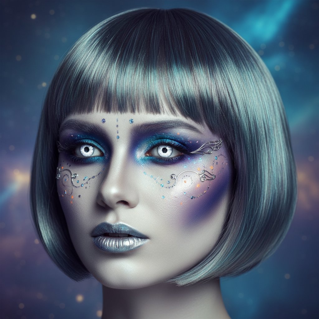 Step into the future with a sleek, metallic-toned bob, complemented by otherworldly makeup for an alien chic look.