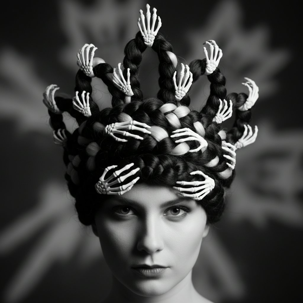 A dramatic black and white braided crown, interwoven with skeleton hands clips, for those reigning over the underworld.