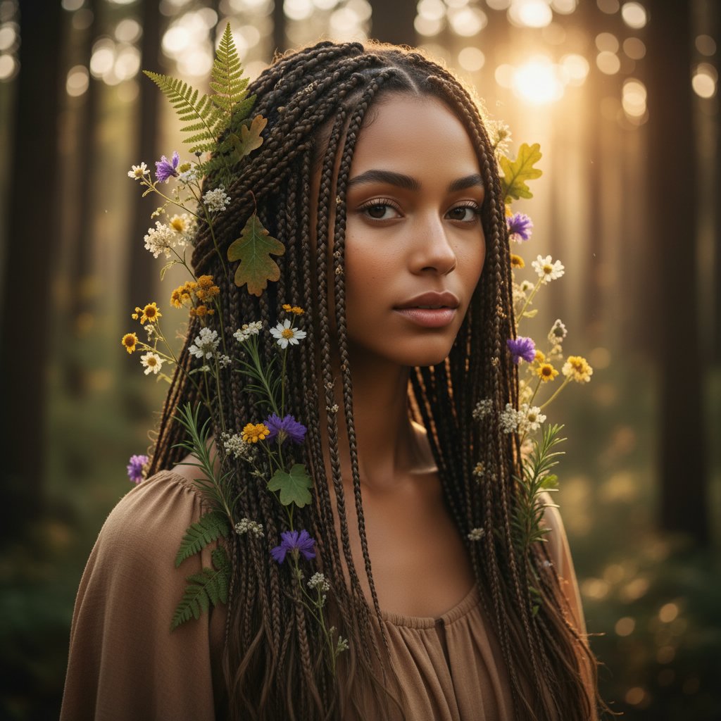 Invoke the spirit of the forest with intricate braids and natural elements like leaves and flowers woven through your hair.