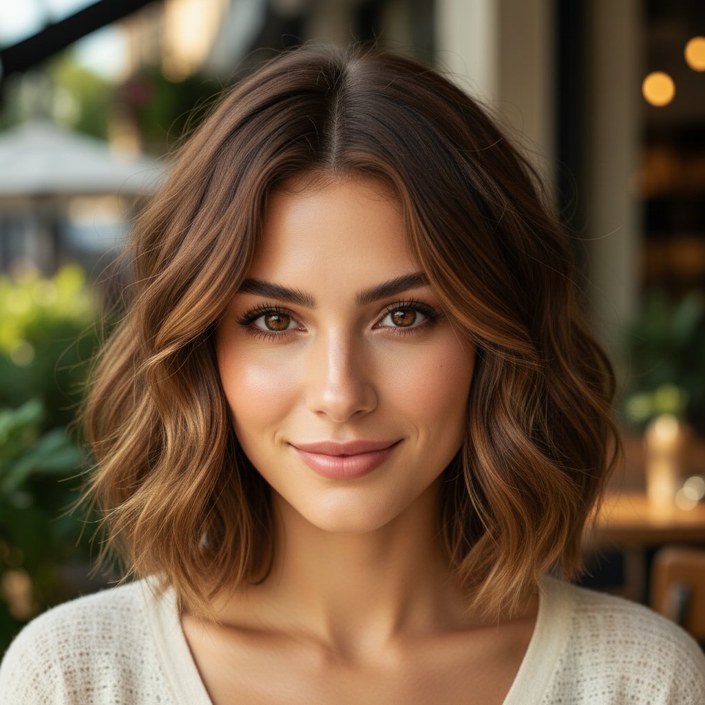 A textured lob that ends just above the shoulders adds volume at the bottom, balancing the face's proportions.