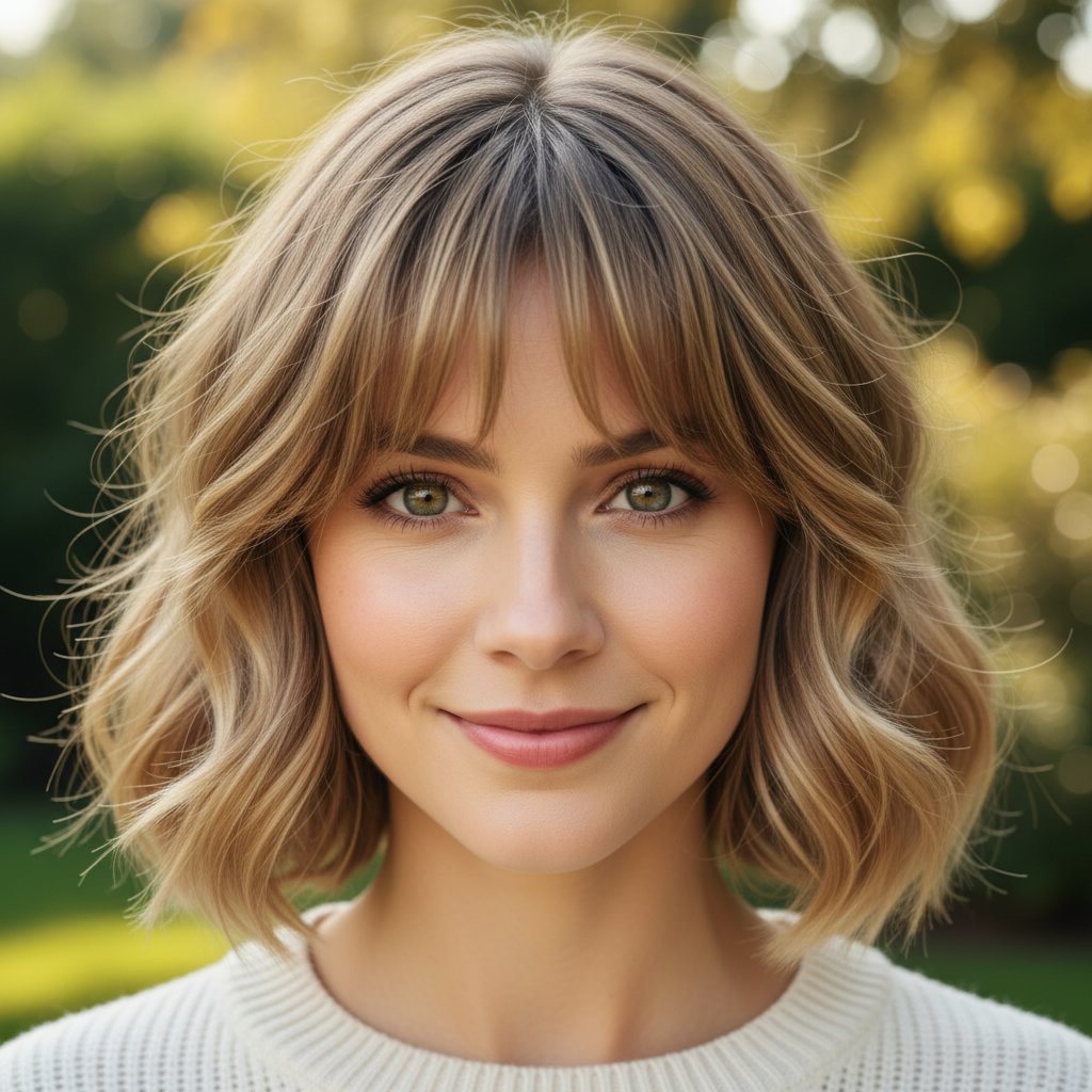 A wavy bob paired with bangs adds texture and volume, softening the forehead's width for a harmonious silhouette.
