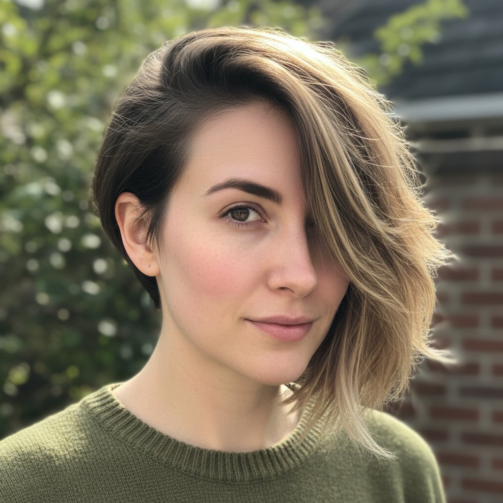 An asymmetrical cut, shorter on one side, can create an interesting visual effect that draws the eye away from the forehead.