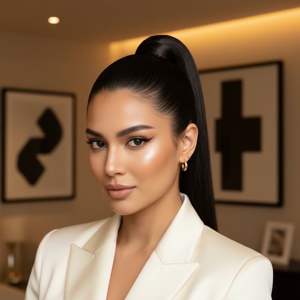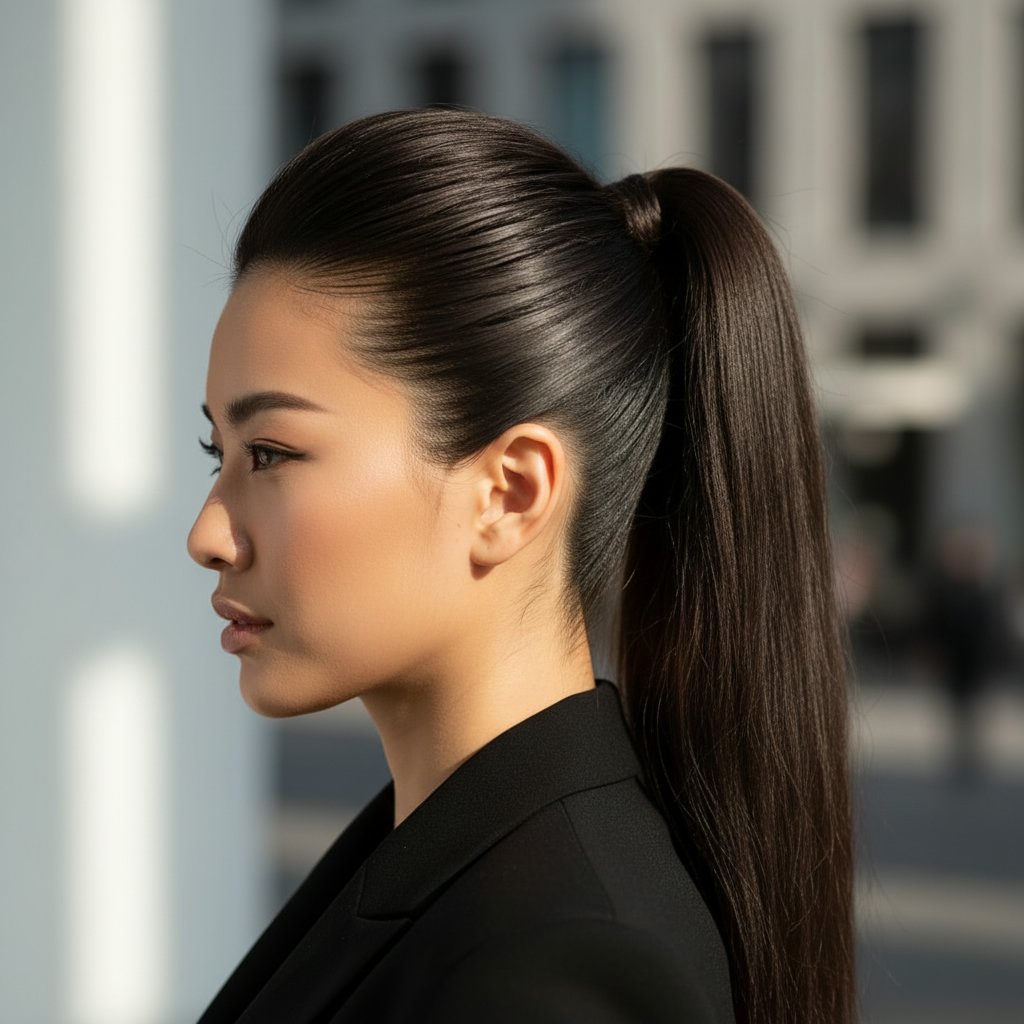 The ultra-sleek high ponytail, with its smooth finish and precise height, offers a polished look perfect for formal events.