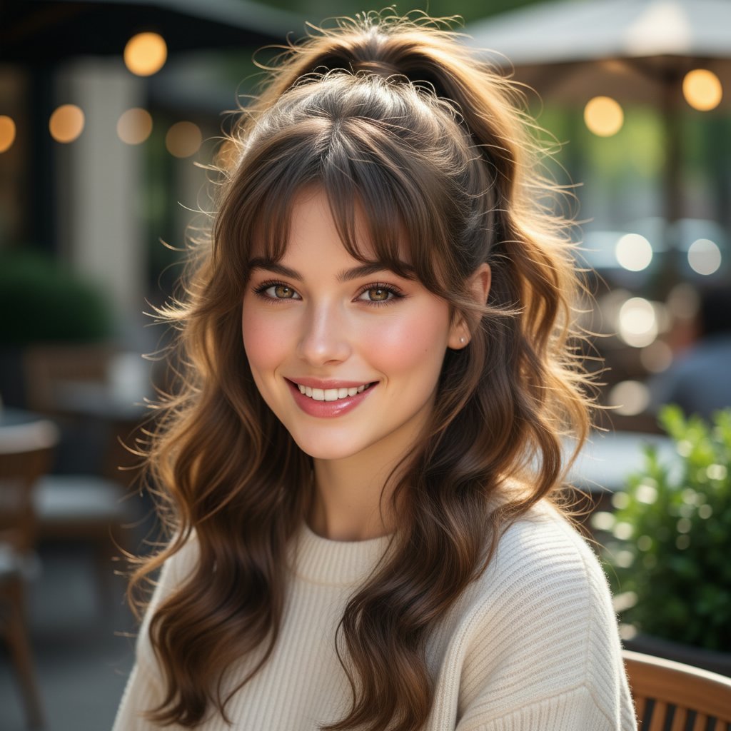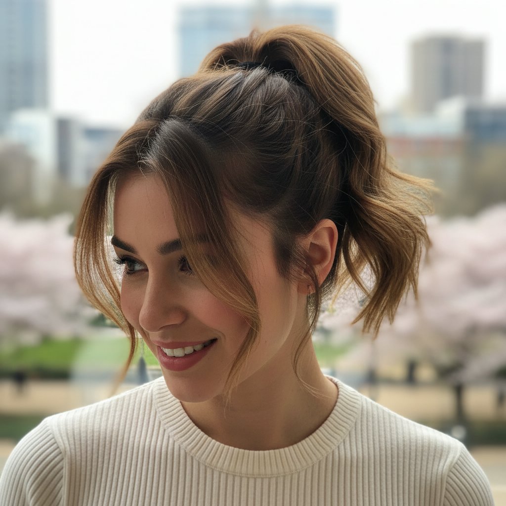 Pairing a high ponytail with bangs frames the face beautifully, offering a youthful and refreshing vibe.