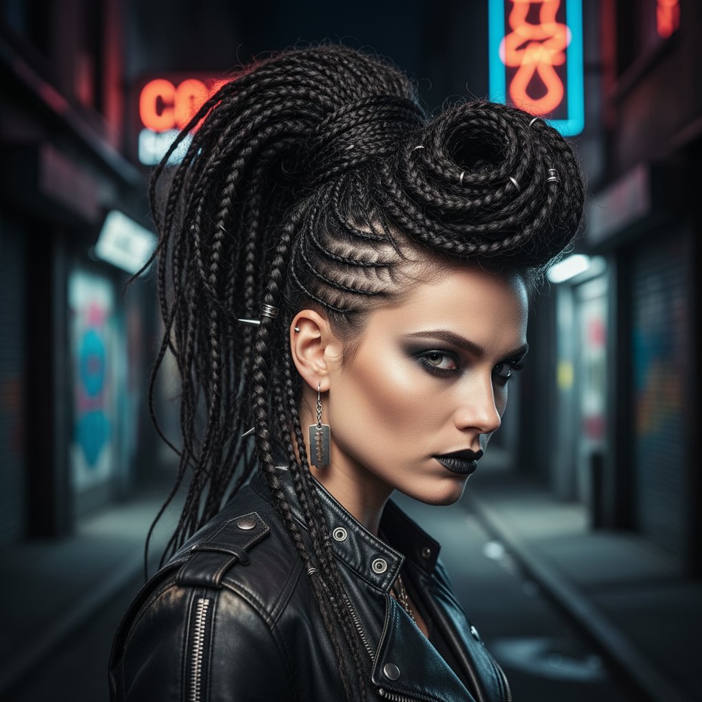 Side braids leading into a high ponytail add an edgy twist to the classic pony, perfect for a distinctive, bold look.