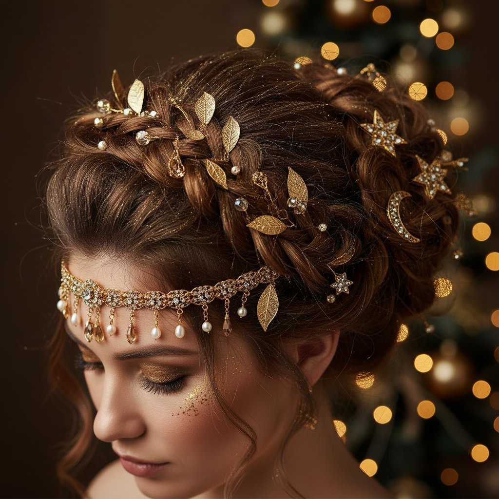 Elevate a simple hairstyle with glittering gold accessories for a touch of holiday magic.