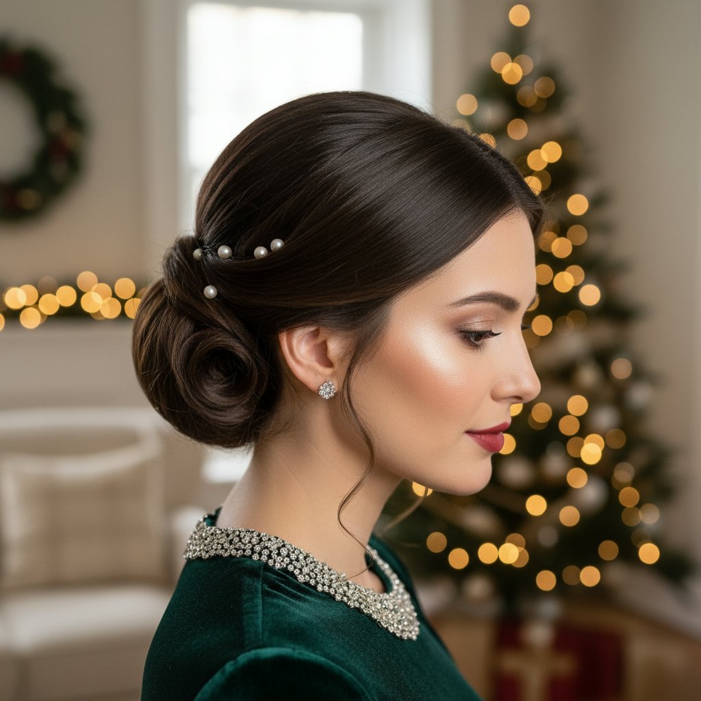 A classic chignon with a modern twist, featuring subtle pearl pins for an elegant holiday look.