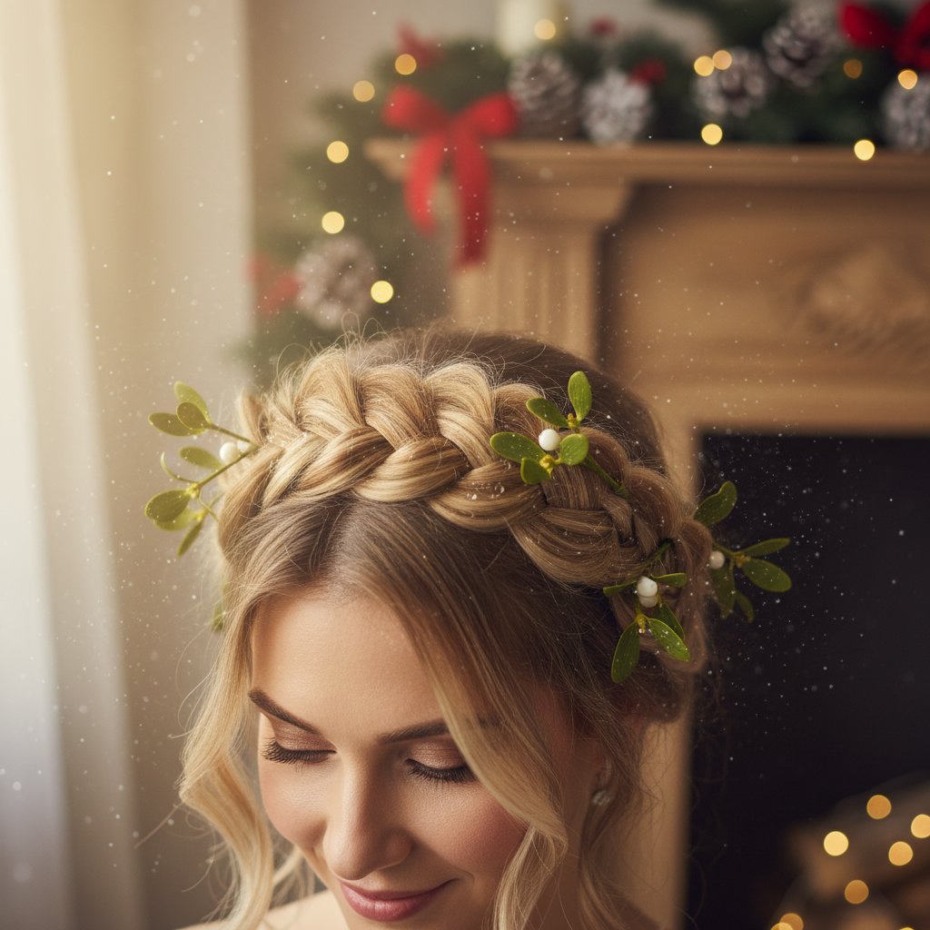 A festive braided crown adorned with mistletoe accents for a whimsical holiday hairstyle.