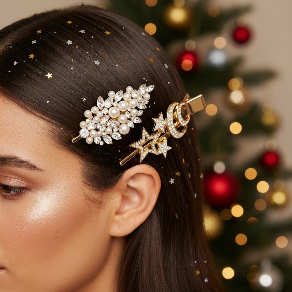 A sleek side part enhanced with statement hair clips for a chic, festive edge.