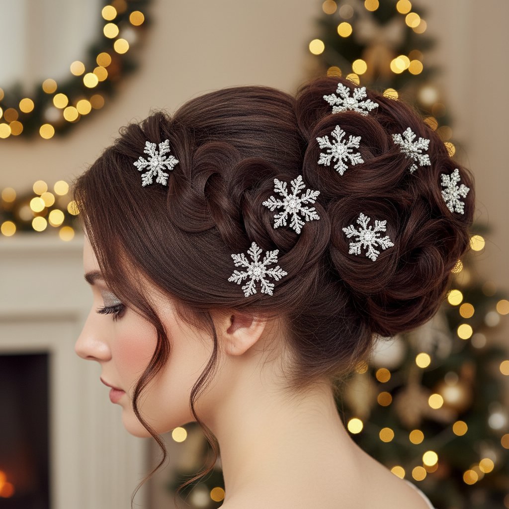 An elegant updo dotted with delicate snowflake hair pins, perfect for a winter holiday party.