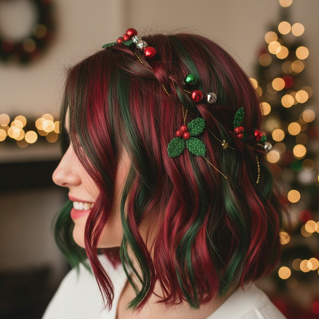 Embrace the holiday spirit with playful red and green hair color accents, a bold and festive choice.