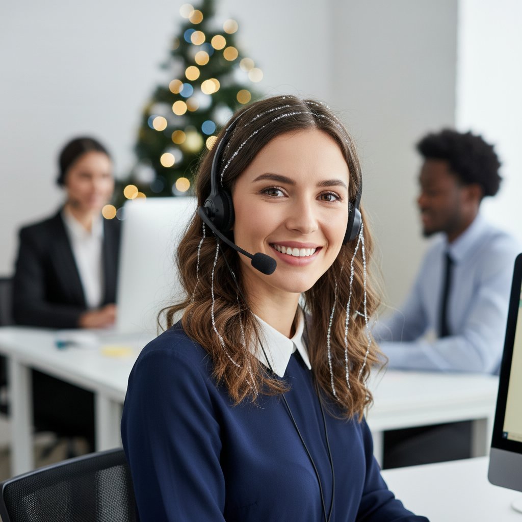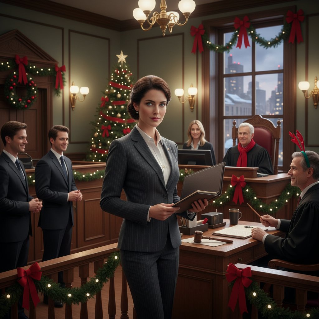 A half-up, half-down hairstyle with ribbon detailing combines professional neatness with holiday charm.