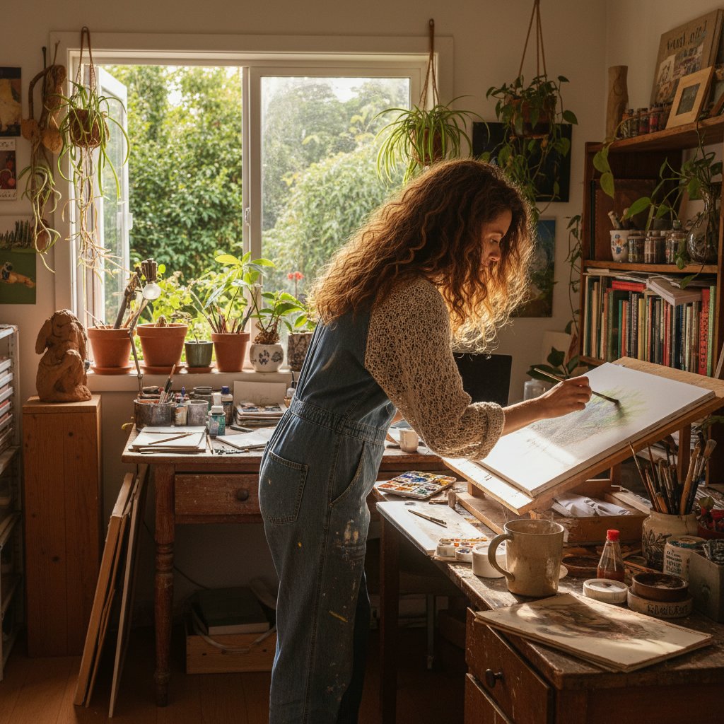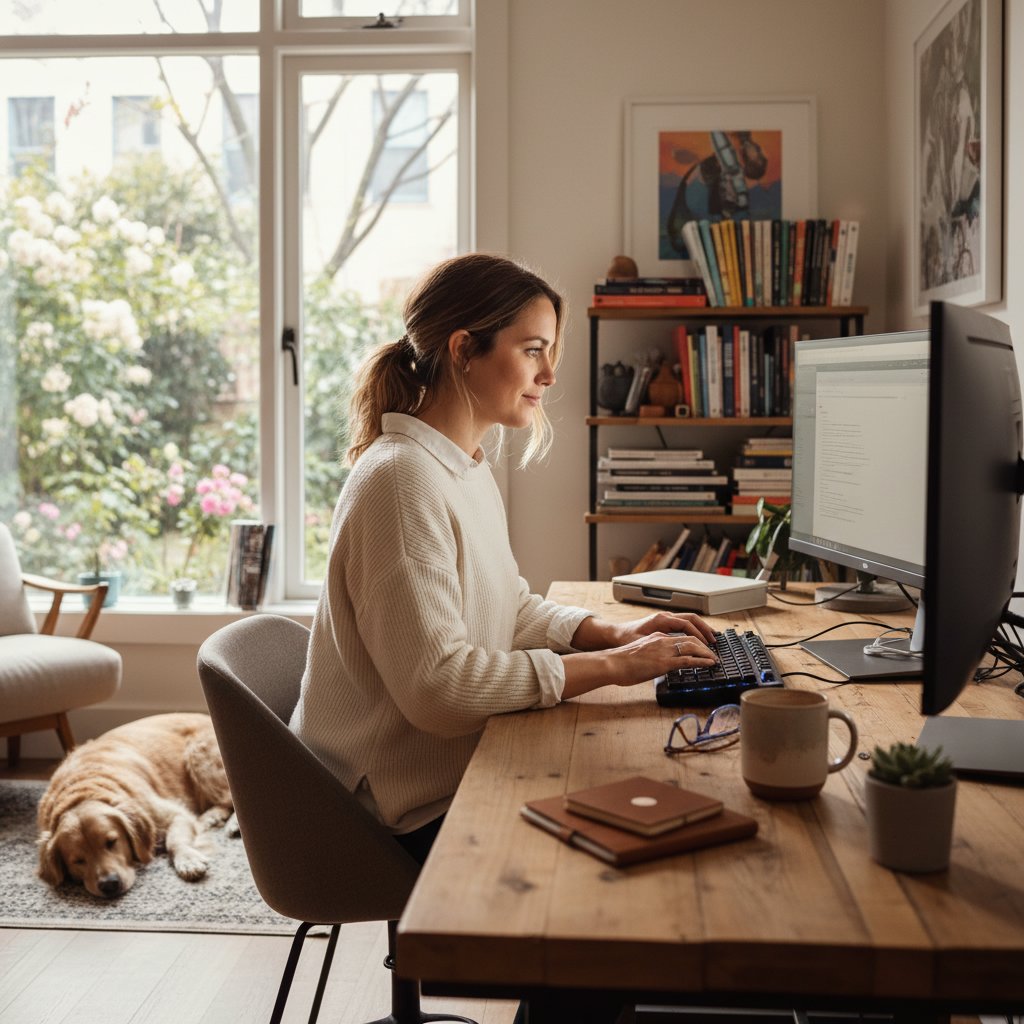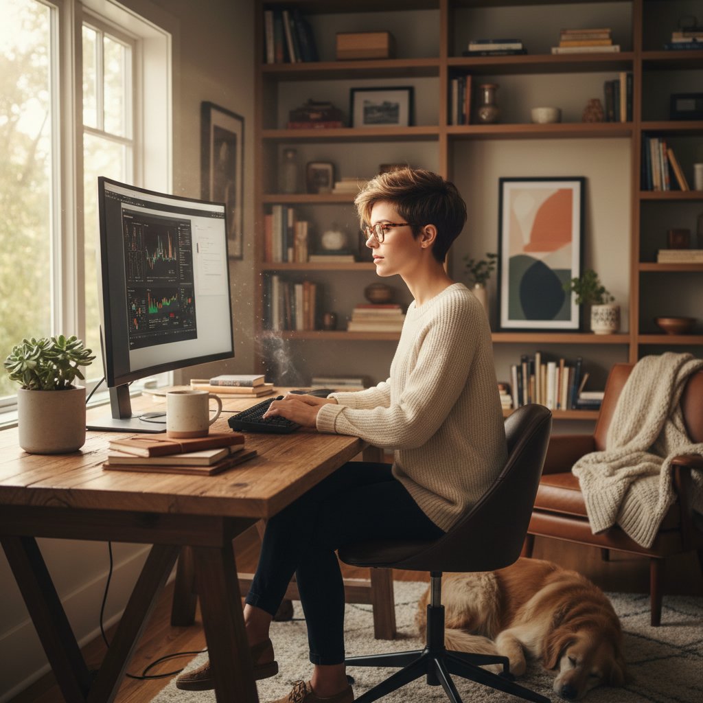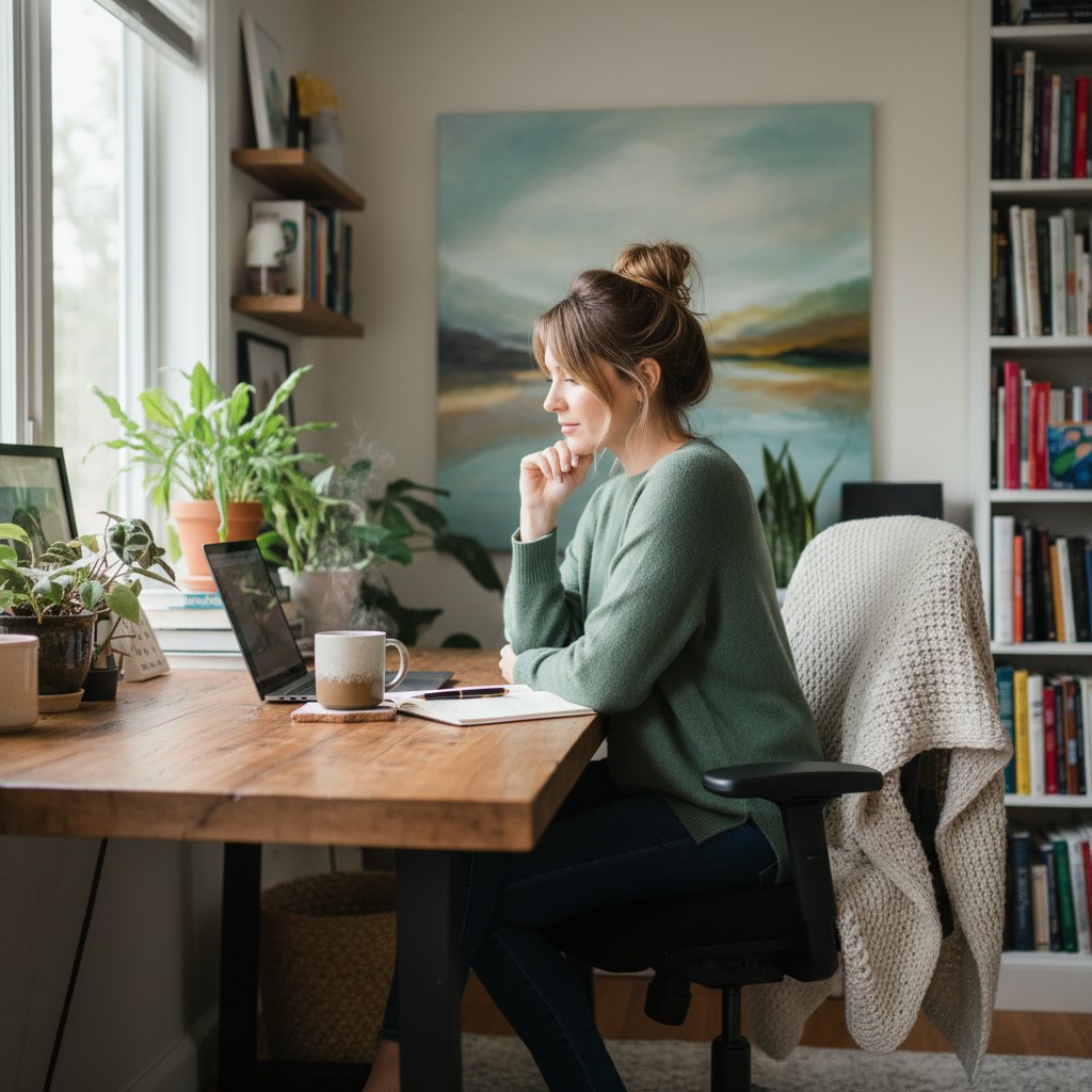 Embracing natural curls with minimal styling showcases confidence and ease, perfect for creative and laid-back home office vibes.