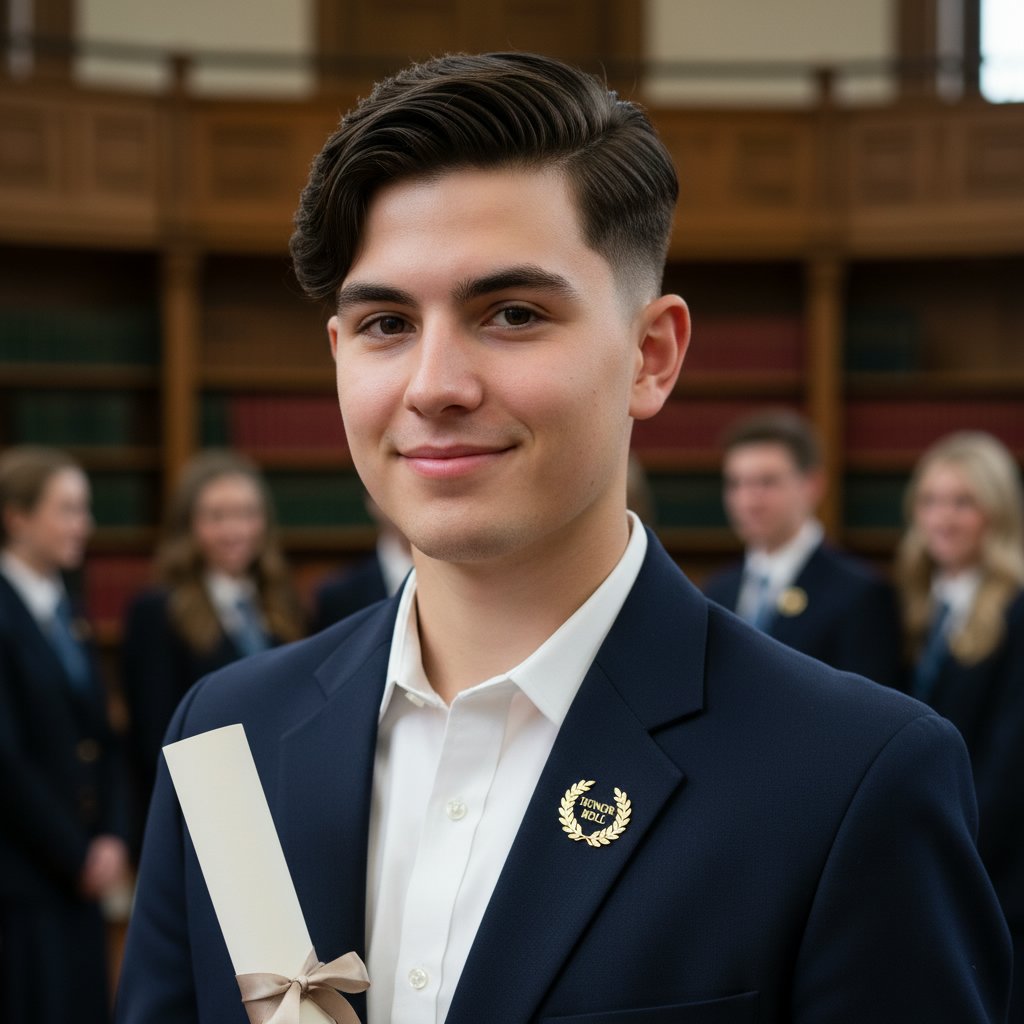 A sophisticated side sweep, reflecting the smart and polished nature of an Honor Roll student, perfect for ceremonial events.