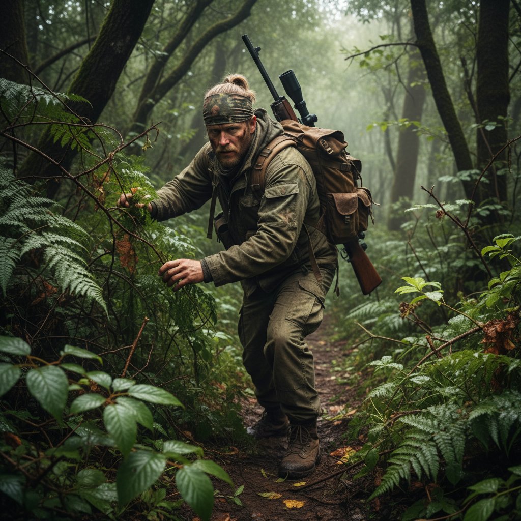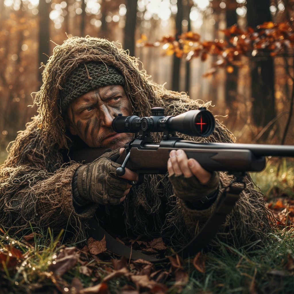 Hair neatly tucked under a camouflage cap, blending seamlessly with the surroundings for ultimate concealment.