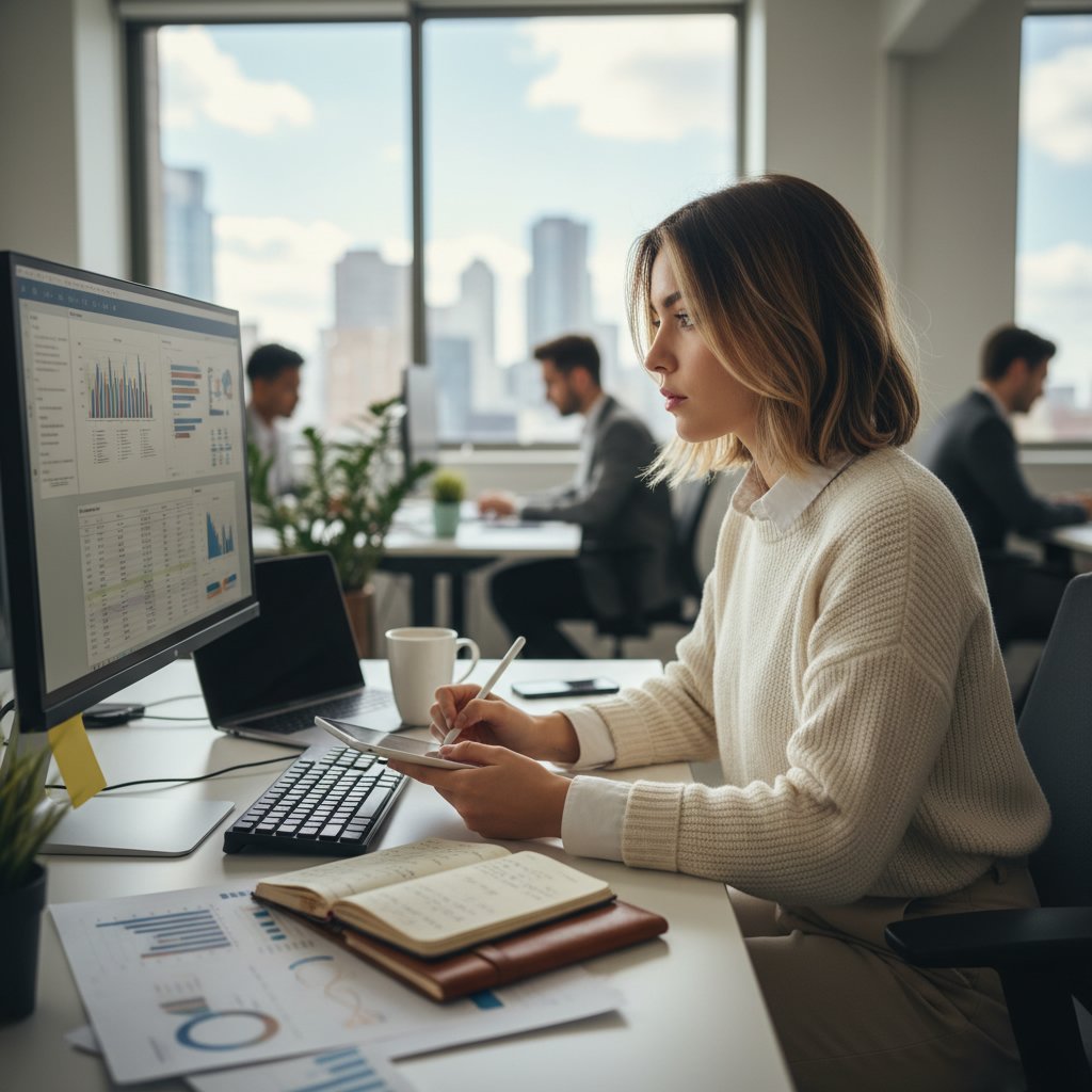 A layered bob provides versatility and ease, suitable for both formal presentations and casual office days.