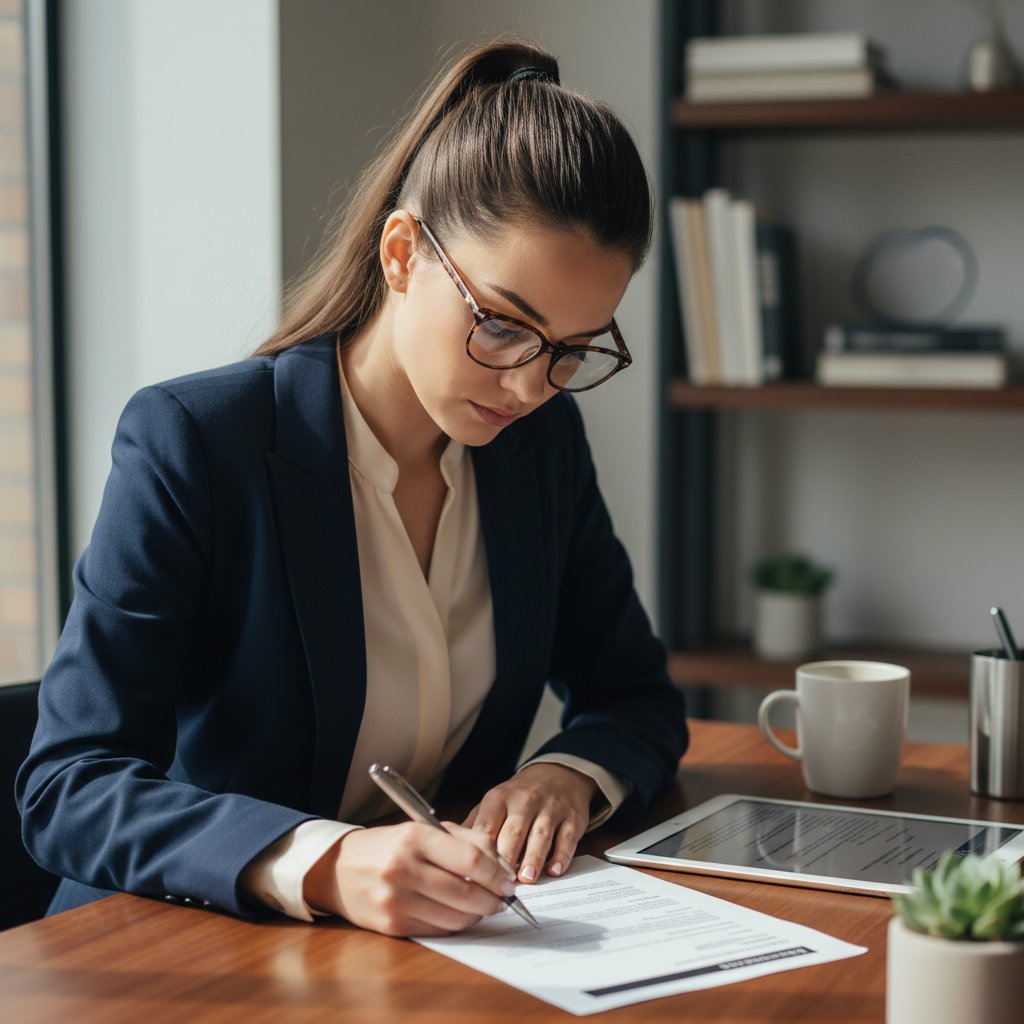 A neatly tied low bun portrays sophistication and readiness, perfect for any interview setting.