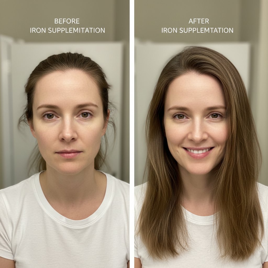 Before: Slow hair growth. After: Noticeable acceleration in hair growth rate with iron supplements.