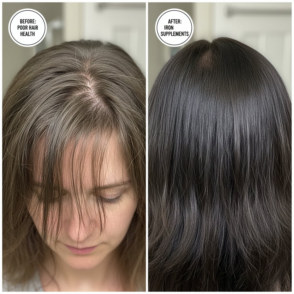 Before: General poor hair health. After: Comprehensive enhancement in hair health and appearance, credited to iron supplements.