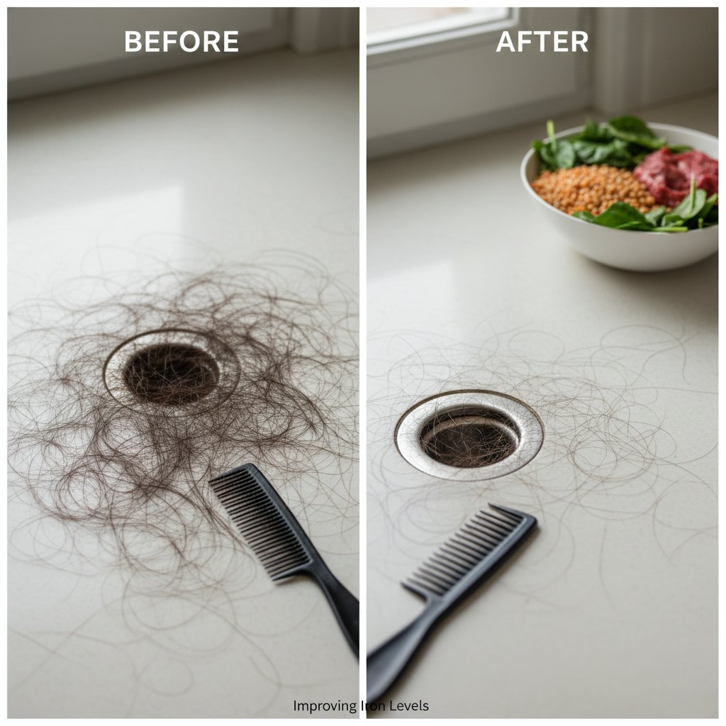 Before: Excessive hair fall. After: Marked reduction in hair fall, thanks to improved iron levels in the diet.