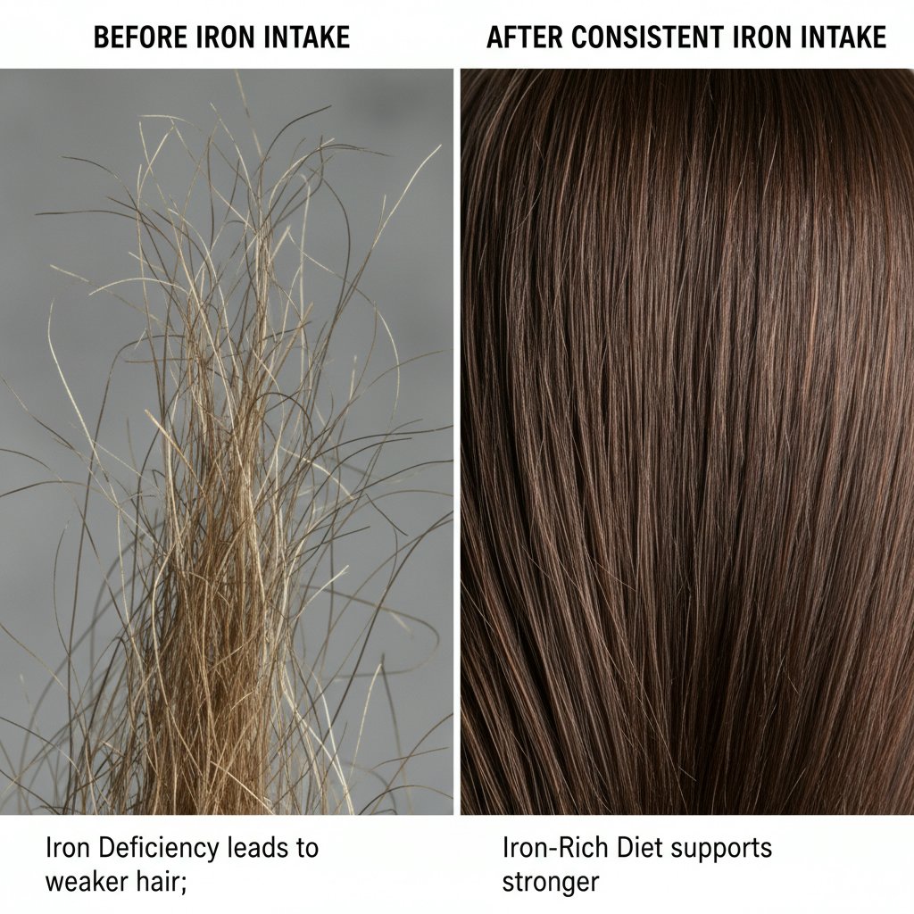 Before: Weak, brittle strands. After: Stronger, more resilient hair strands from consistent iron intake.