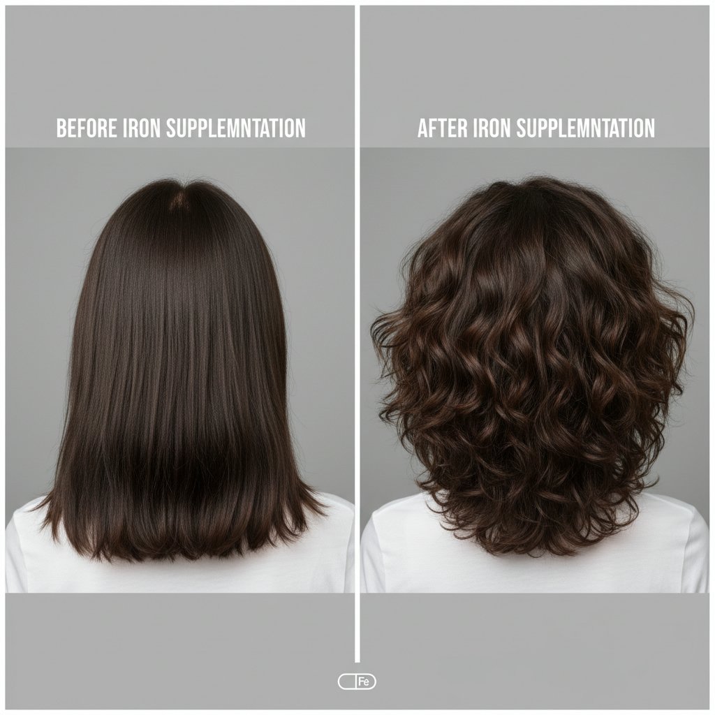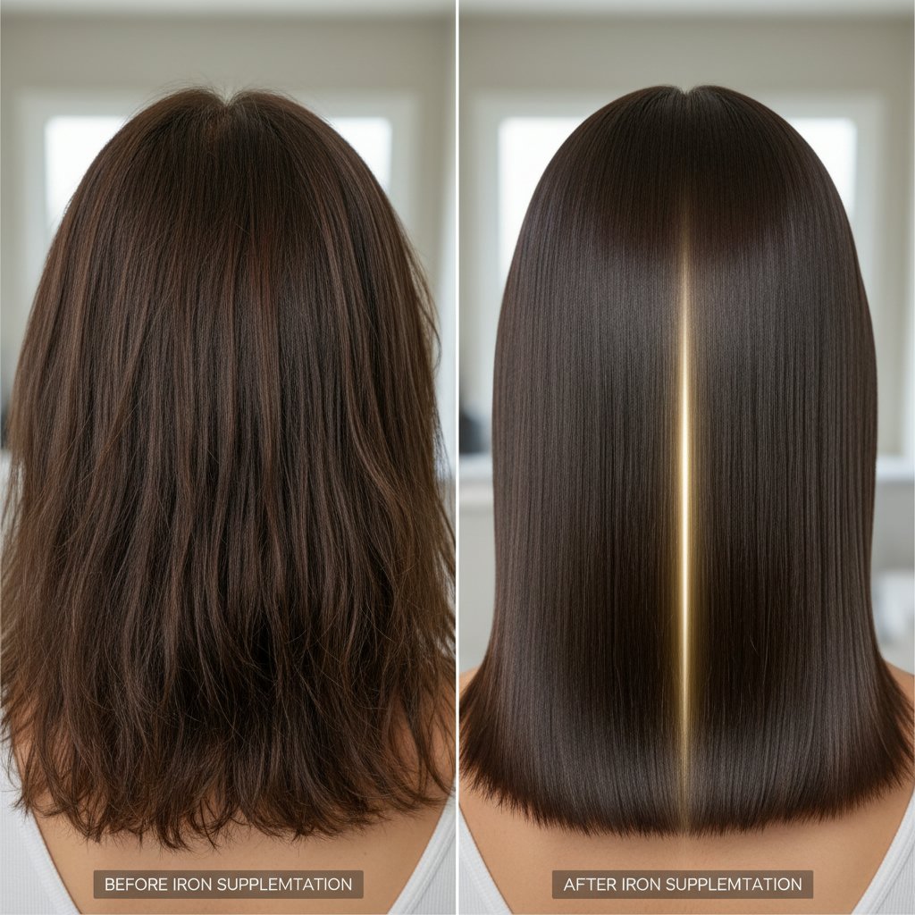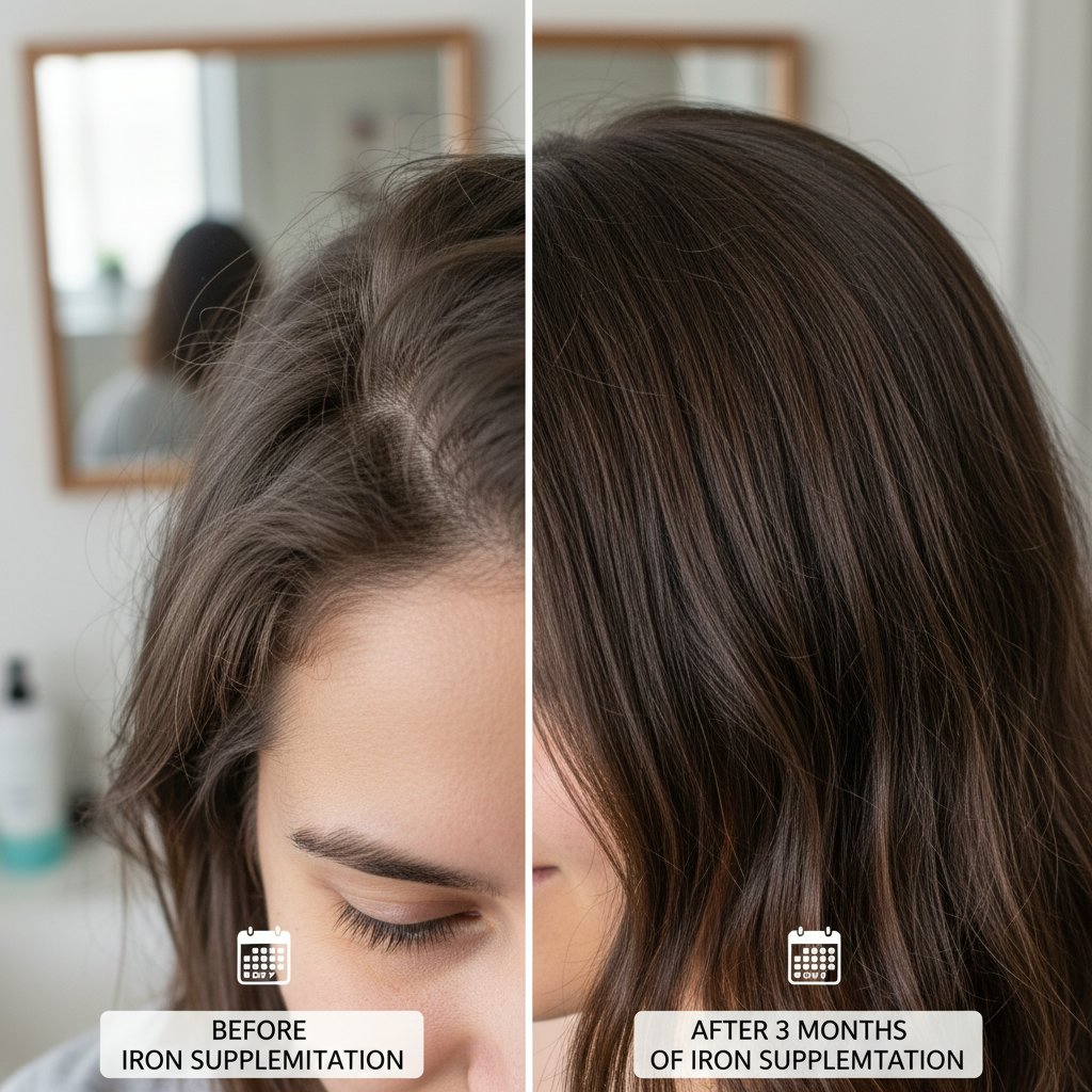 Before: Noticeable thinning. After: Increased hair density, showcasing the effectiveness of iron supplementation.