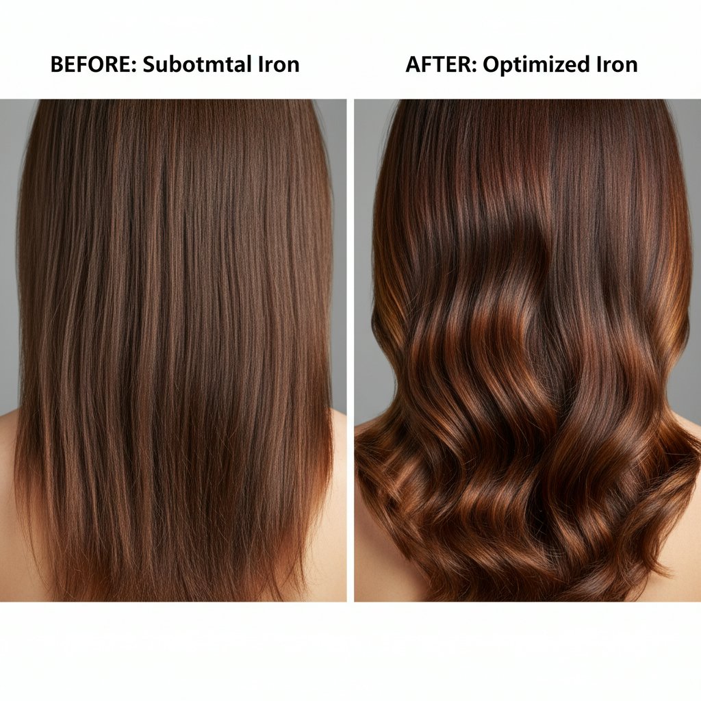 Before: Lackluster hair. After: Restored shine and luster, highlighting the impact of iron on hair health.