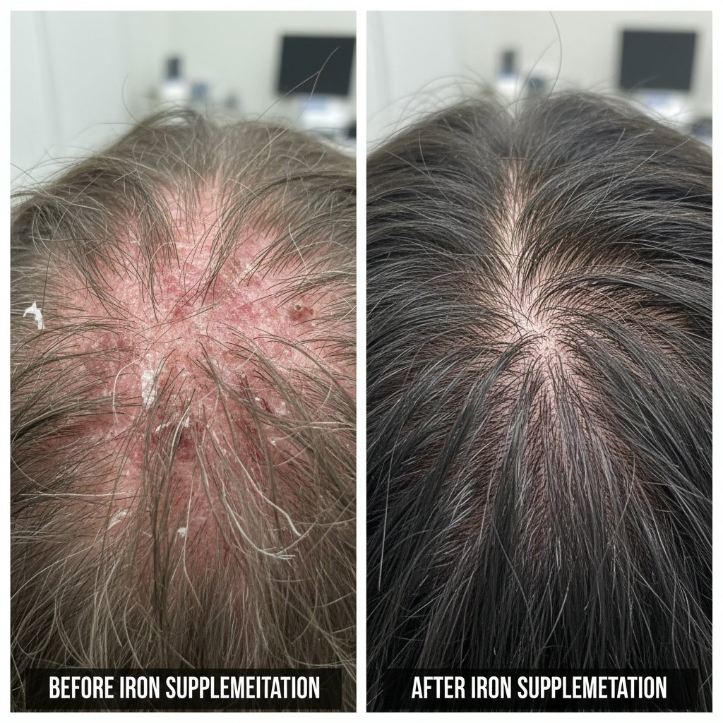 Before: Unhealthy scalp conditions. After: Improved scalp health, fostering a better environment for hair growth with iron.