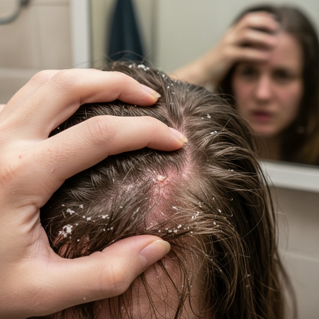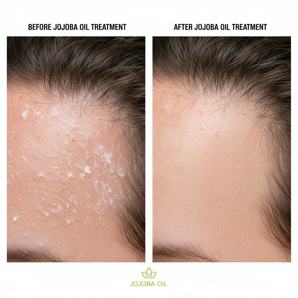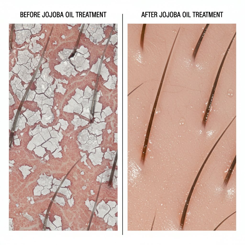 Before: Scalp with visible dandruff. After: Clear, dandruff-free scalp post jojoba oil treatment.