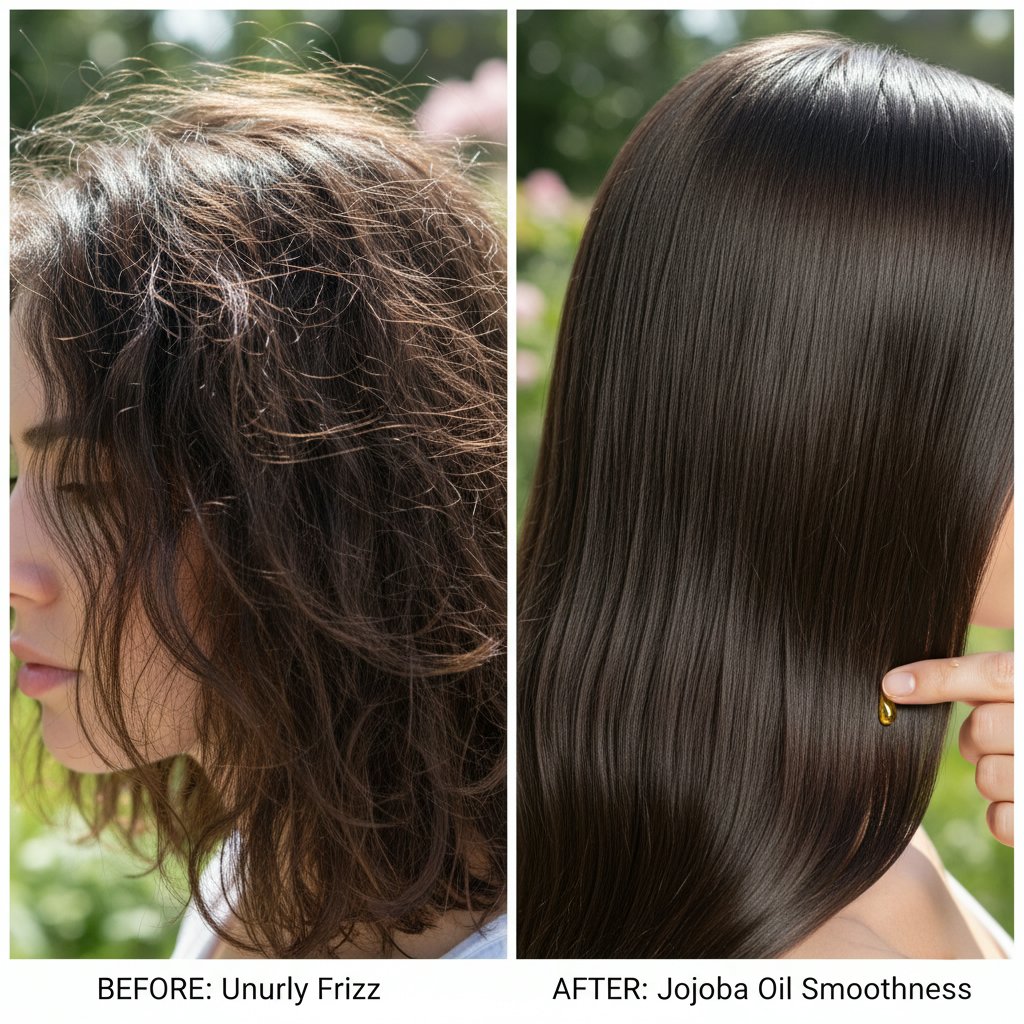 Before: Unruly frizz and flyaways. After: Smooth, manageable hair achieved with the smoothing effect of jojoba oil.