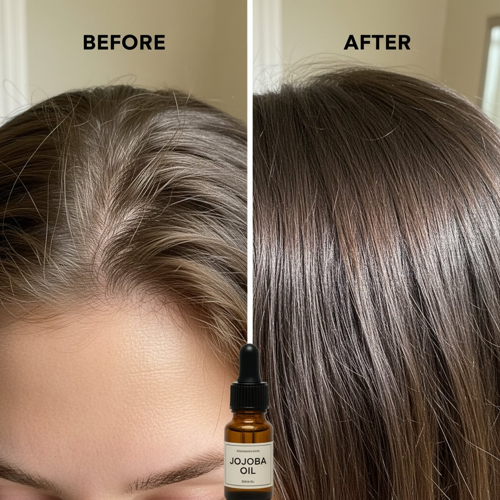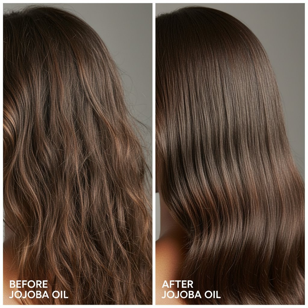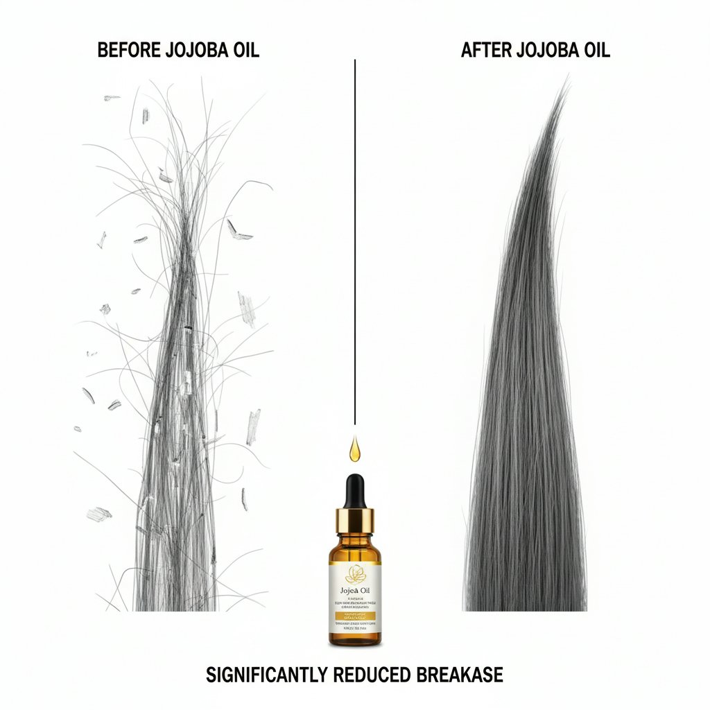Before: Brittle hair prone to breakage. After: Strengthened hair with significantly reduced breakage from jojoba oil use.