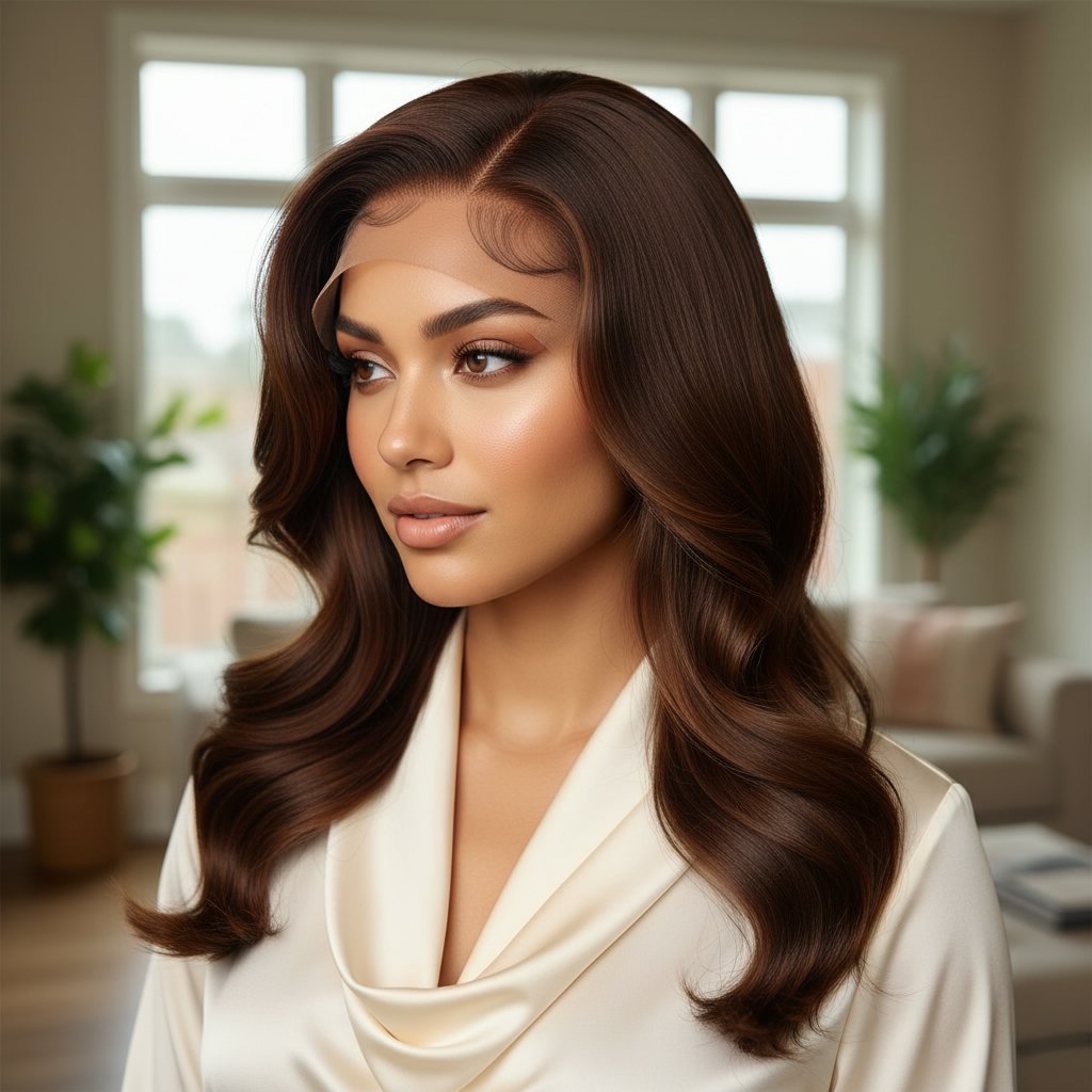 An elegant side part lace front wig, demonstrating the versatility in styling while maintaining a completely natural hairline appearance.