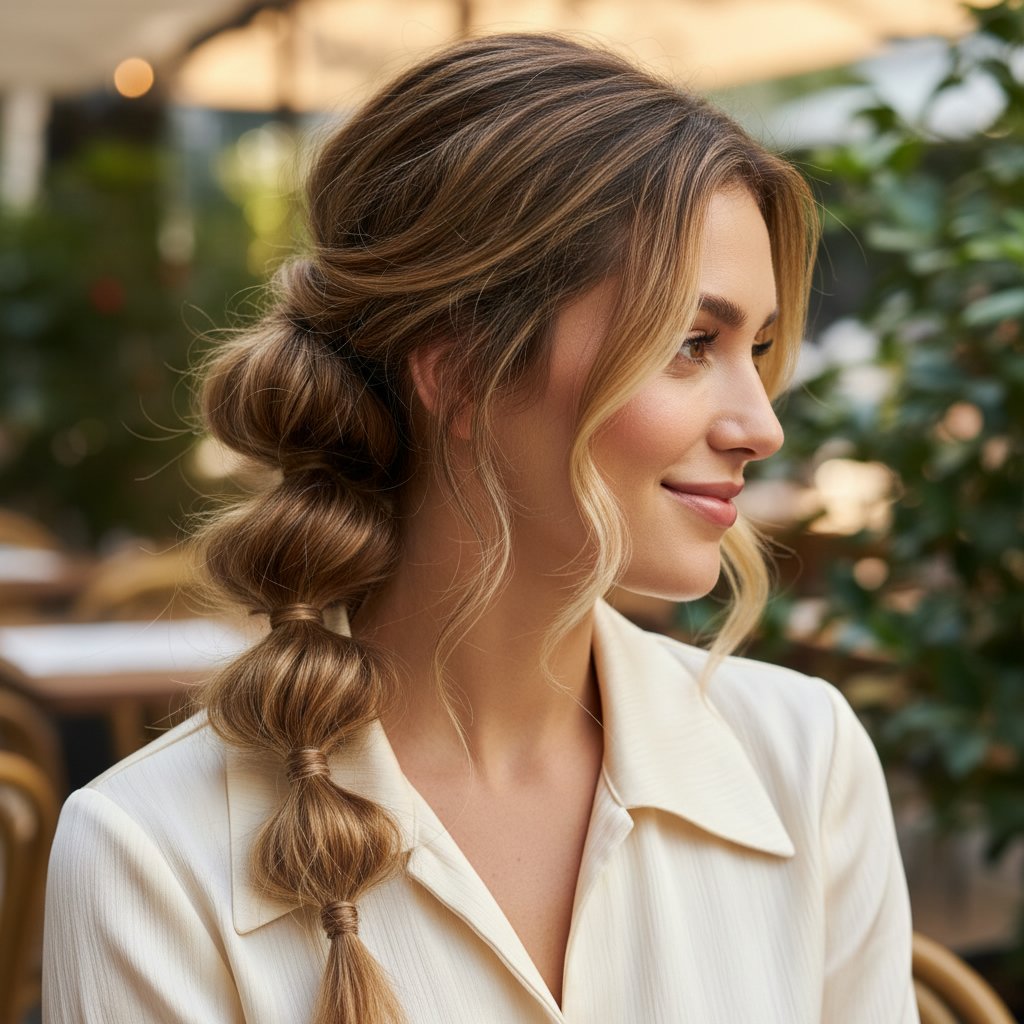 The bubble low ponytail is a playful yet chic variation, adding volume and personality to the classic tail.