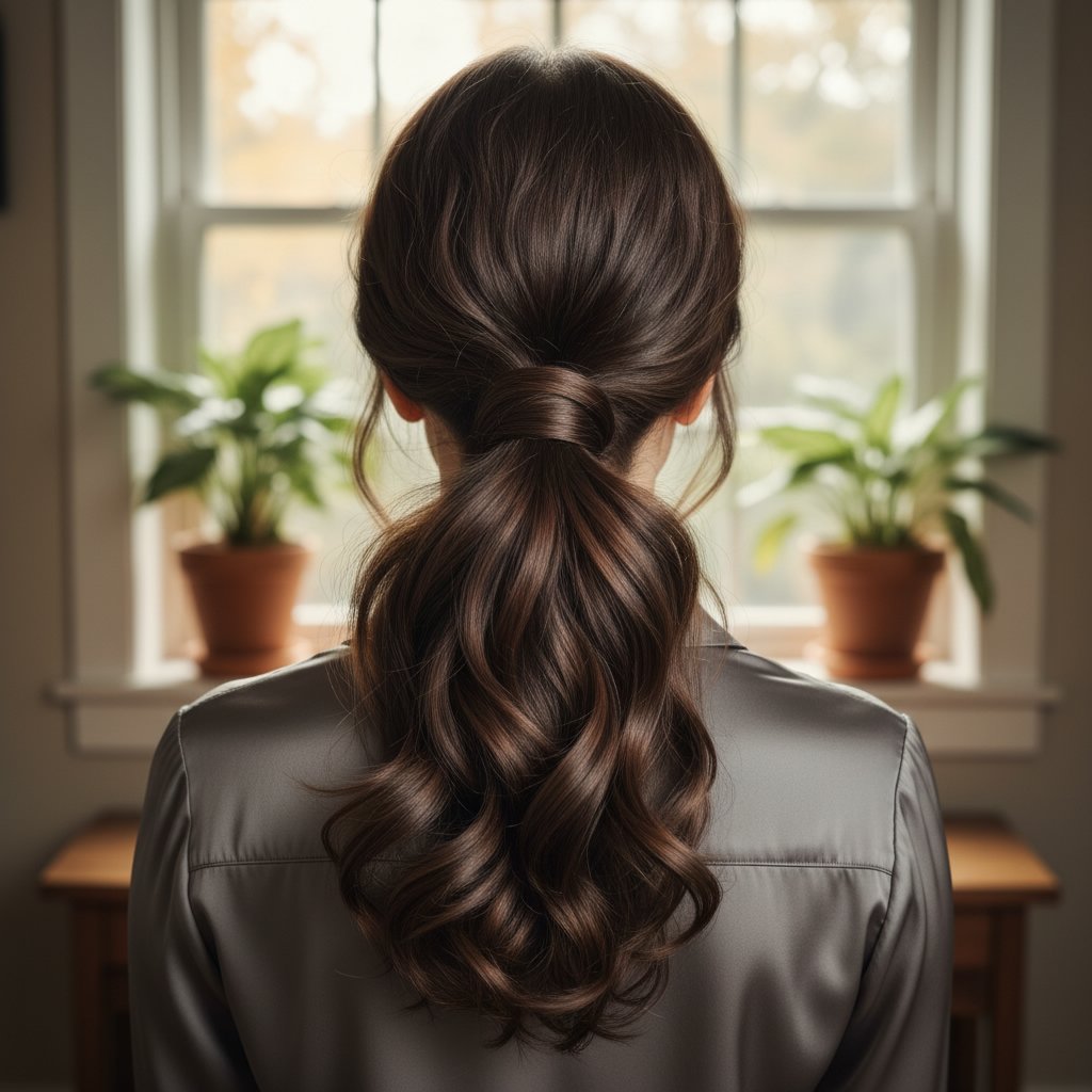 The sleek low ponytail offers a polished finish, perfect for professional settings or elegant evenings.