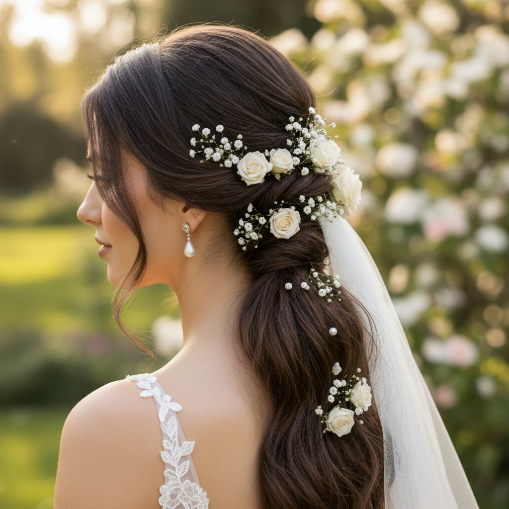 A bridal low ponytail, often embellished with flowers or pearls, offers a timeless and elegant hairstyle choice for the big day.