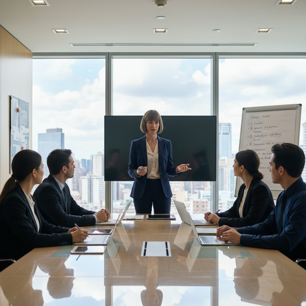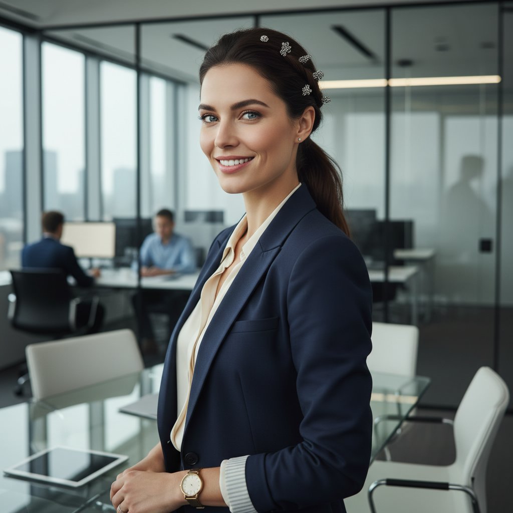 A neatly styled pixie cut showcases confidence and efficiency, perfect for navigating through tight schedules and critical meetings.