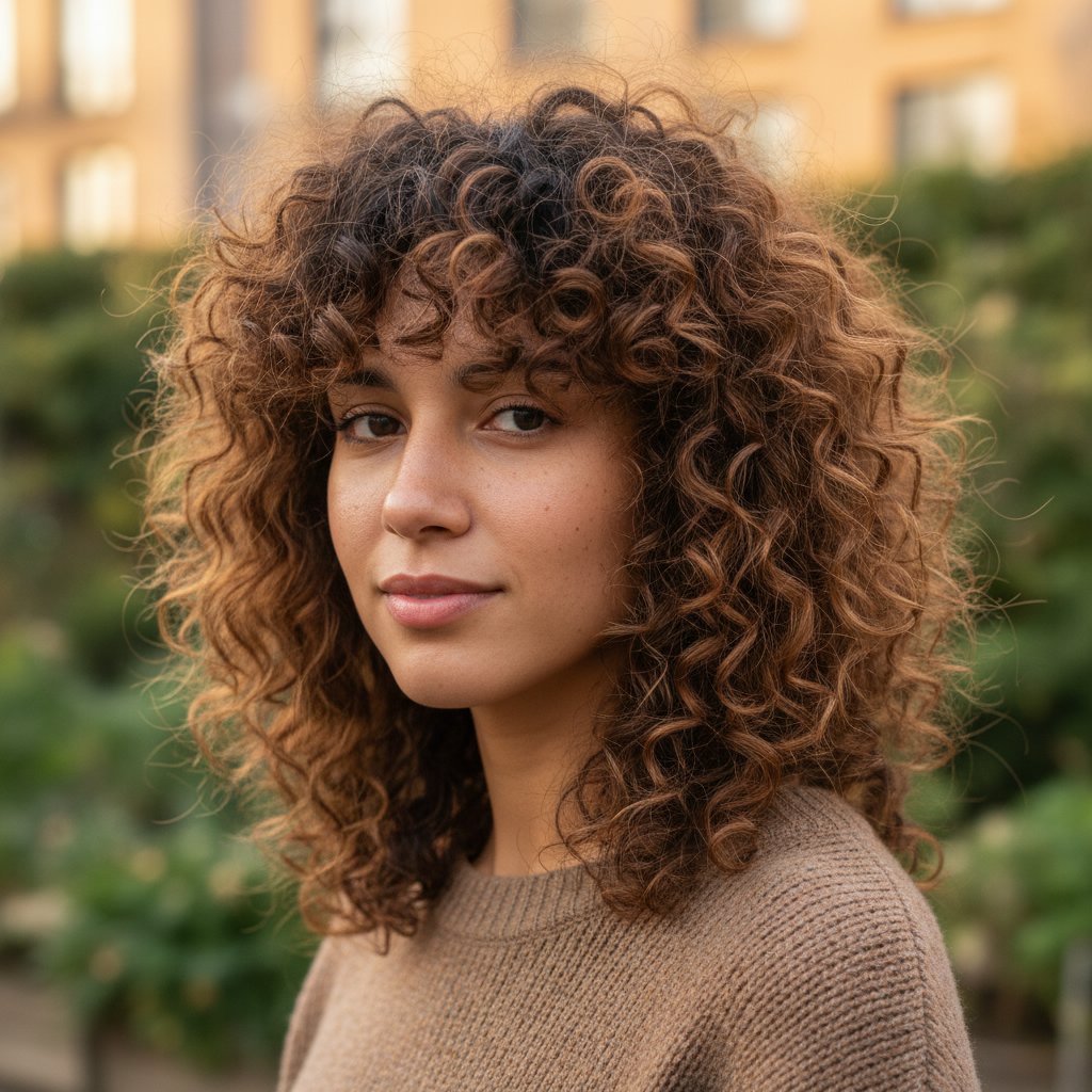 Curly hair gets a wolf cut makeover, with layers designed to enhance the curls' natural bounce and texture.