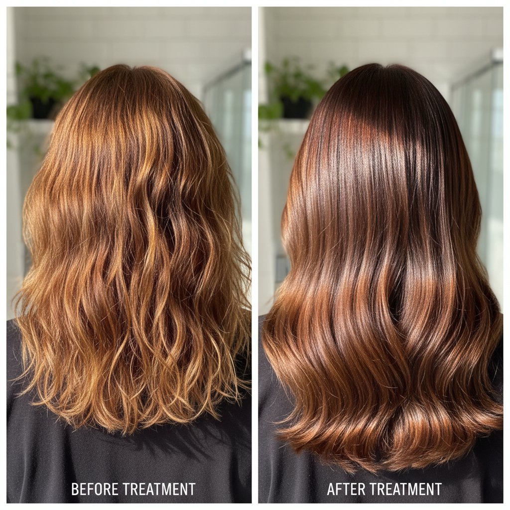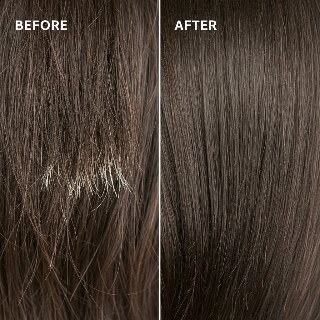 Before: Visible signs of damage and split ends. After: Healthier-looking hair with reduced appearance of damage.