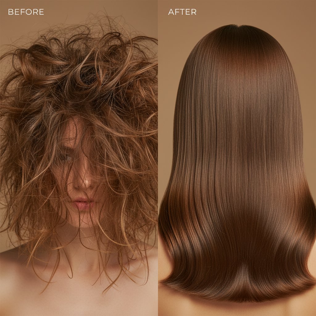 Before: Rough, hard-to-manage texture. After: Silky smooth hair that flows freely, thanks to deep hydration.