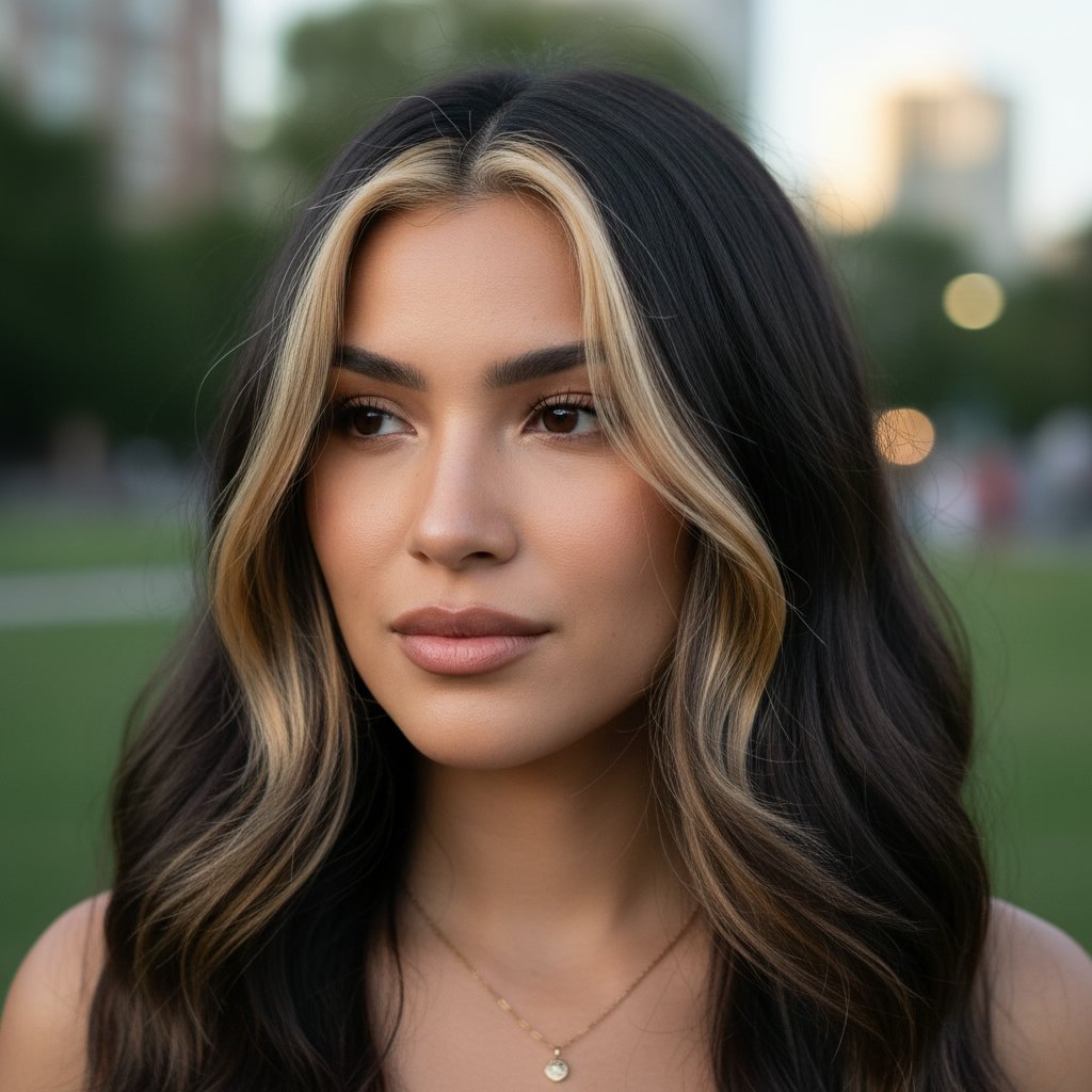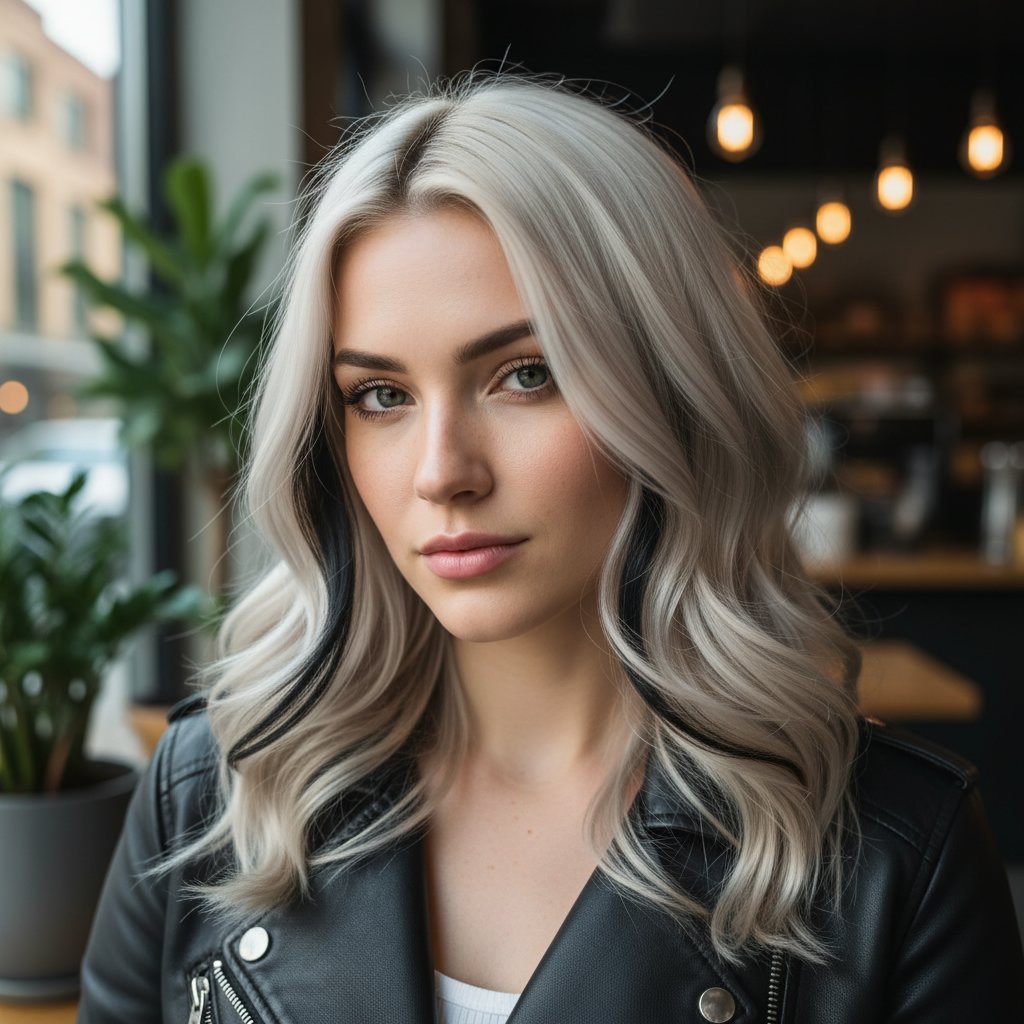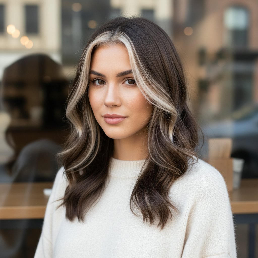 Platinum blonde money piece highlights on brunette hair create a striking contrast, illuminating the face with a sleek, modern edge.