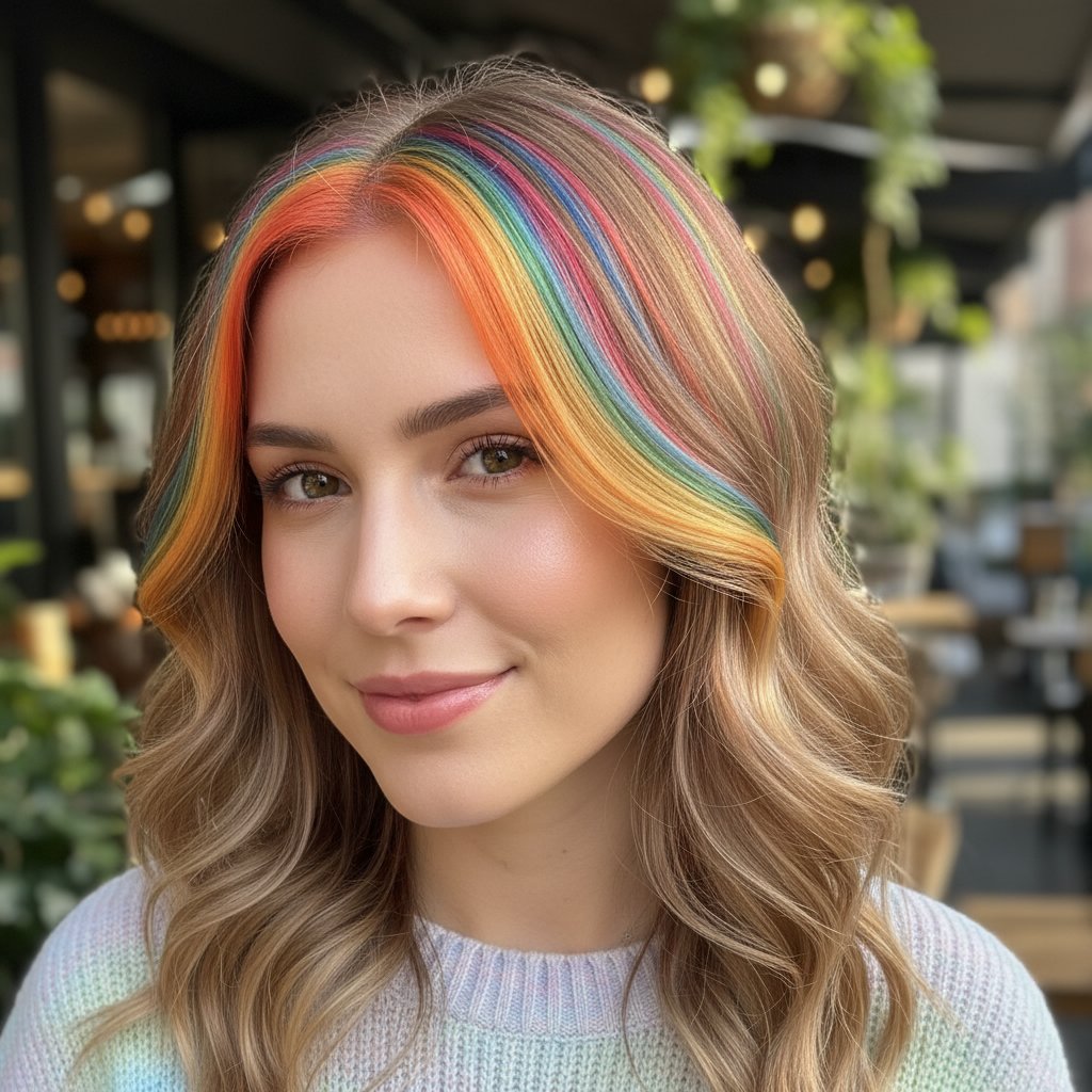 For the daring, rainbow money piece highlights add a splash of color, showcasing vibrant hues that frame the face with playful boldness.