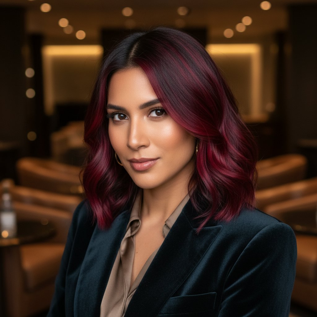 Deep red money piece highlights bring a fiery contrast to darker hair, creating an edgy, yet sophisticated frame for the face.