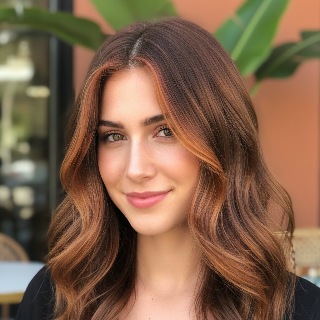 Rich auburn money piece highlights add a touch of elegance to brown hair, enhancing its natural beauty with warm, reddish tones.