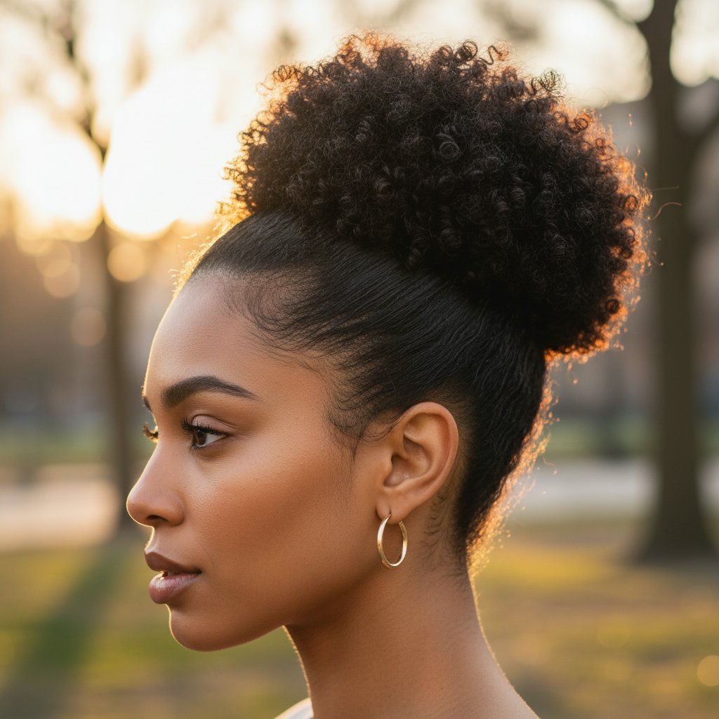 The sleek puff pulls natural hair into a stylish updo, offering a chic way to manage curls with elegance.