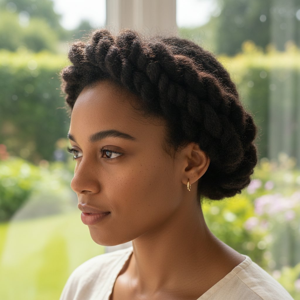 The twisted halo is a testament to the versatility of natural hair, weaving strands into a divine and elegant headpiece.